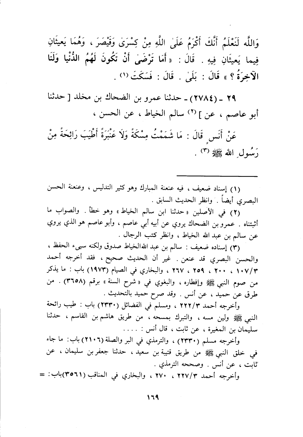 2784 - حَدَّثَنَا عَمْرُو بْنُ الضَّحَّاكِ بْنِ مَخْلَدٍ، حَدَّثَنَا أَبُو عَاصِمٍ، عَنْ سَالِمٍ الْخَيَّاطِ، عَنِ الْحَسَنِ، عَنْ أَنَسٍ، قَالَ: «§مَا شَمَمْتُ مِسْكَةً، وَلَا عَنْبَرَةً أَطْيَبَ رَائِحَةً مِنْ رَسُولِ اللَّهِ صَلَّى اللهُ عَلَيْهِ وَسَلَّمَ» Kإسناده ضعيف