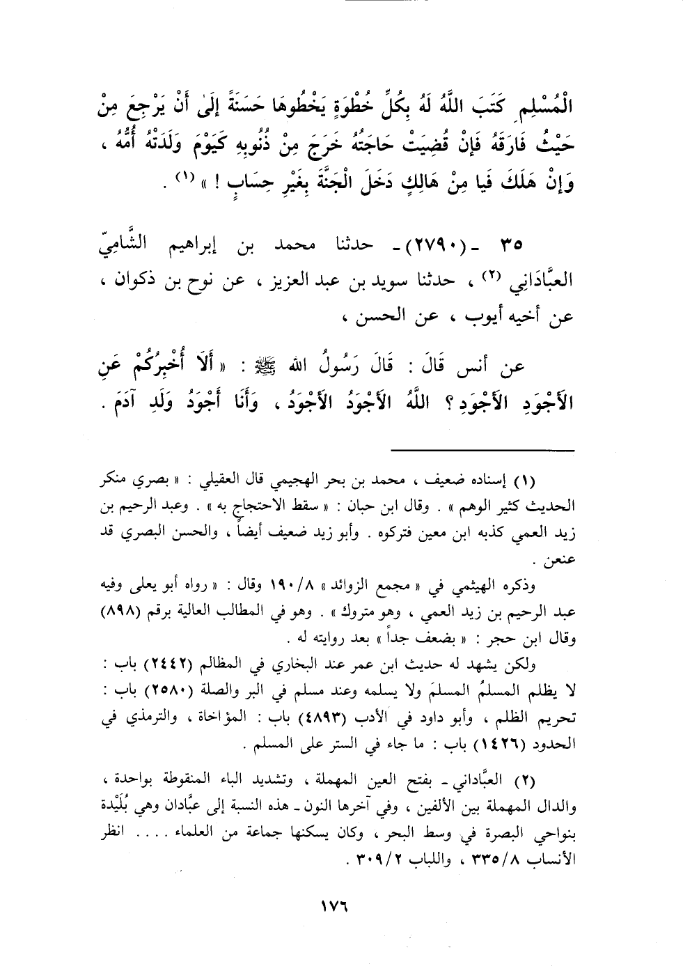 2790 - حَدَّثَنَا مُحَمَّدُ بْنُ إِبْرَاهِيمَ الشَّامِيُّ الْعَبَّادَانِيُّ، حَدَّثَنَا سُوَيْدُ بْنُ عَبْدِ الْعَزِيزِ، عَنْ نُوحِ بْنِ ذَكْوَانَ، عَنْ أَخِيهِ أَيُّوبَ، عَنِ الْحَسَنِ، عَنْ أَنَسٍ، قَالَ: قَالَ رَسُولُ اللَّهِ صَلَّى اللهُ عَلَيْهِ وَسَلَّمَ: " §أَلَا أُخْبِرُكُمْ عَنِ الْأَجْوَدِ الْأَجْوَدِ؟: اللَّهُ الْأَجْوَدُ الْأَجْوَدُ، وَأَنَا أَجْوَدُ وَلَدِ آدَمَ -[177]-، وَأَجْوَدُهُمْ مِنْ بَعْدِي رَجُلٌ عَلِمَ عِلْمًا فَنَشَرَ عِلْمَهُ يُبْعَثُ يَوْمَ الْقِيَامَةِ أَمَةً وَاحِدَةً، وَرَجُلٌ جَادَ بِنَفْسِهِ فِي سَبِيلِ اللَّهِ حَتَّى يُقْتَلَ "Kإسناده مسلسل بالضعفاء