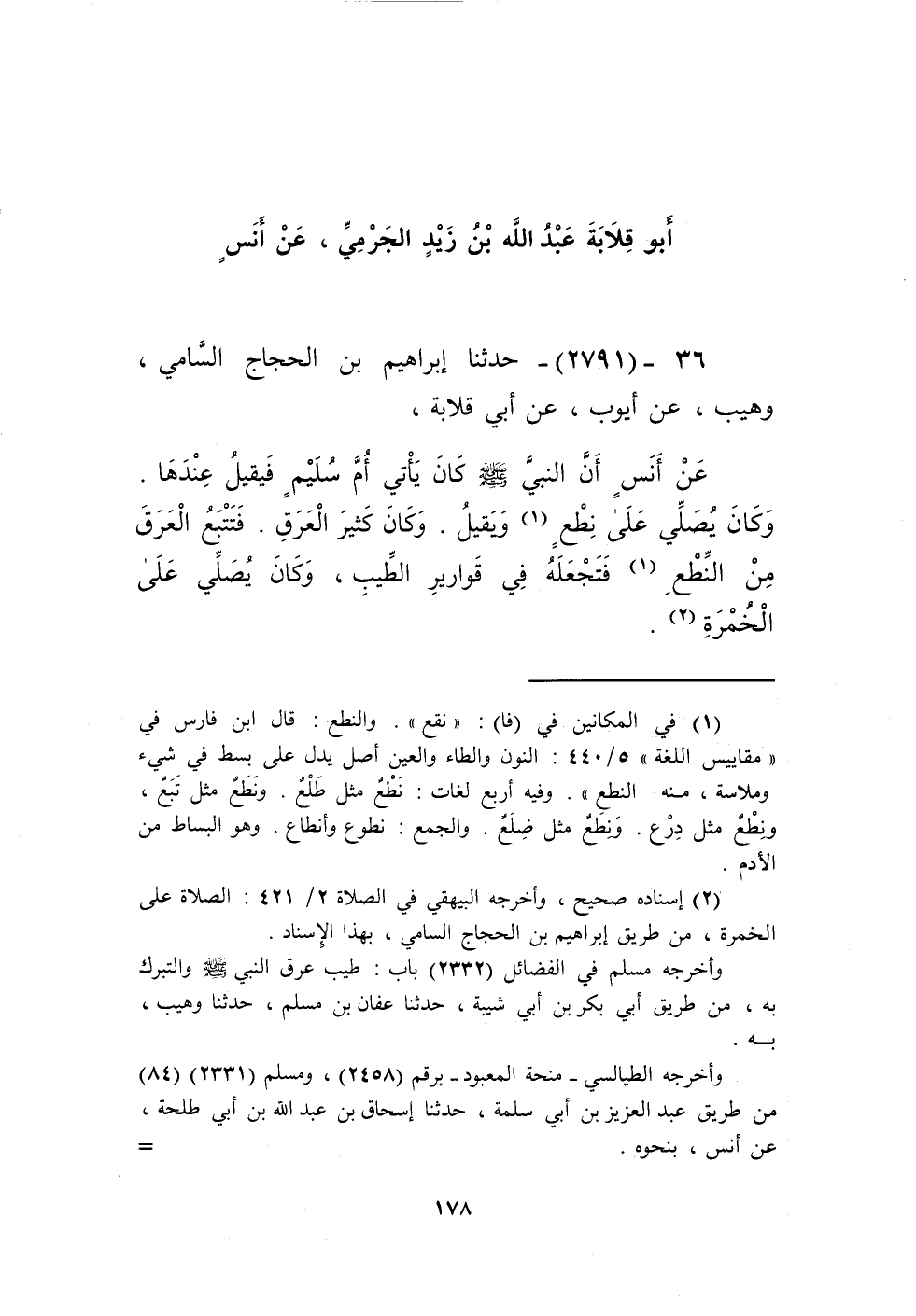 2791 - حَدَّثَنَا إِبْرَاهِيمُ بْنُ الْحَجَّاجِ السَّامِيُّ، وُهَيْبٌ، عَنْ أَيُّوبَ، عَنْ أَبِي قِلَابَةَ، عَنْ أَنَسٍ، «أَنَّ النَّبِيَّ صَلَّى اللهُ عَلَيْهِ وَسَلَّمَ كَانَ §يَأْتِي أُمَّ سُلَيْمٍ فَيَقِيلُ عِنْدَهَا، وَكَانَ يُصَلِّي عَلَى نِطْعٍ وَيَقِيلُ، وَكَانَ كَثِيرَ الْعَرَقِ فَتَتَّبِعُ الْعَرَقَ مِنَ النِّطْعِ فَتَجْعَلُهُ فِي قَوَارِيرِ الطِّيبِ، وَكَانَ يُصَلِّي عَلَى الْخُمْرَةِ» Kإسناده صحيح