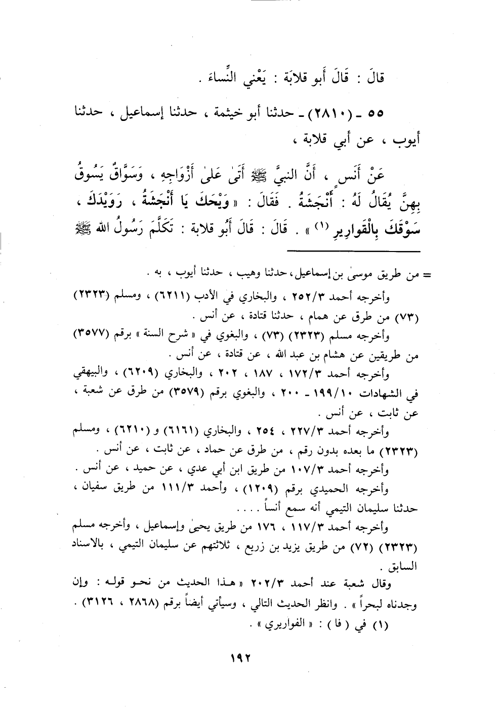 2810 - حَدَّثَنَا أَبُو خَيْثَمَةَ، حَدَّثَنَا إِسْمَاعِيلُ، حَدَّثَنَا أَيُّوبُ، عَنْ أَبِي قِلَابَةَ، عَنْ أَنَسٍ، أَنَّ النَّبِيَّ صَلَّى اللهُ عَلَيْهِ وَسَلَّمَ أَتَى عَلَى أَزْوَاجِهِ وَسَوَّاقٌ يَسُوقُ بِهِنَّ يُقَالُ لَهُ أَنْجَشَةُ فَقَالَ: «§وَيْحَكَ يَا أَنْجَشَةُ، رُوَيْدَكَ سَوْقَكَ بِالْقَوَارِيرِ» قال: قَالَ أَبُو قِلَابَةَ: تَكَلَّمَ رَسُولُ اللَّهِ صَلَّى اللهُ عَلَيْهِ وَسَلَّمَ بِكَلِمَةٍ لَوْ تَكَلَّمَ بِهَا بَعْضُكُمْ لَعِبْتُمُوهَا عَلَيْهِKإسناده صحيح