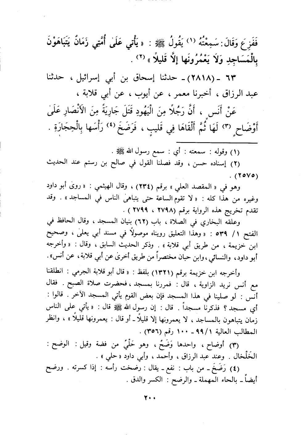 2818 - حَدَّثَنَا إِسْحَاقُ بْنُ أَبِي إِسْرَائِيلَ، حَدَّثَنَا عَبْدُ الرَّزَّاقِ، أَخْبَرَنَا مَعْمَرٌ، عَنْ أَيُّوبَ، عَنْ أَبِي قِلَابَةَ، عَنْ أَنَسٍ: أَنَّ رَجُلًا مِنَ الْيَهُودِ قَتَلَ جَارِيَةً مِنَ الْأَنْصَارِ عَلَى أَوْضَاحٍ لَهَا، ثُمَّ أَلْقَاهَا فِي قَلِيبٍ، فَرَضَخَ رَأْسَهَا بِالْحِجَارَةِ -[201]-، فَأُخِذَ، فَأُتِيَ بِهِ النَّبِيُّ صَلَّى اللهُ عَلَيْهِ وَسَلَّمَ، «§فَأَمَرَ بِهِ أَنْ يُرْجَمَ، فَرُجِمَ حَتَّى مَاتَ» Kإسناده صحيح