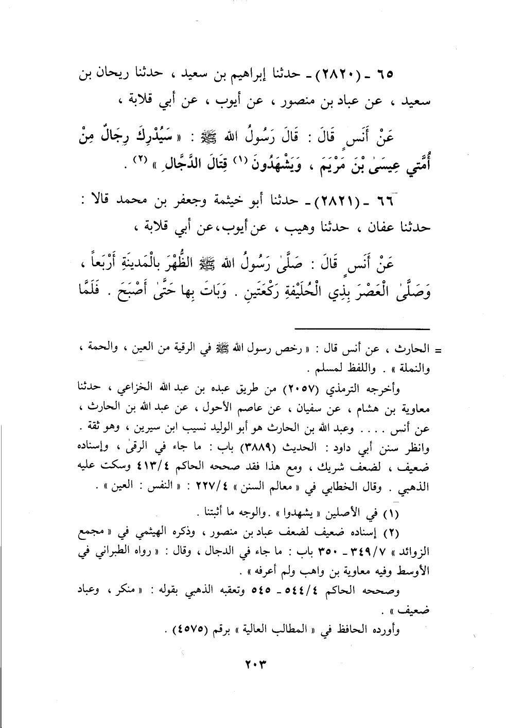 2820 - حَدَّثَنَا إِبْرَاهِيمُ بْنُ سَعِيدٍ، حَدَّثَنَا رَيْحَانُ بْنُ سَعِيدٍ، عَنْ عَبَّادِ بْنِ مَنْصُورٍ، عَنْ أَيُّوبَ، عَنْ أَبِي قِلَابَةَ، عَنْ أَنَسٍ، قَالَ: قَالَ رَسُولُ اللَّهِ صَلَّى اللهُ عَلَيْهِ وَسَلَّمَ: «§سَيُدْرِكُ رِجَالٌ مِنْ أُمَّتِي عِيسَى ابْنَ مَرْيَمَ، وَيَشْهَدُونَ قِتَالَ الدَّجَّالِ» Kإسناده ضعيف