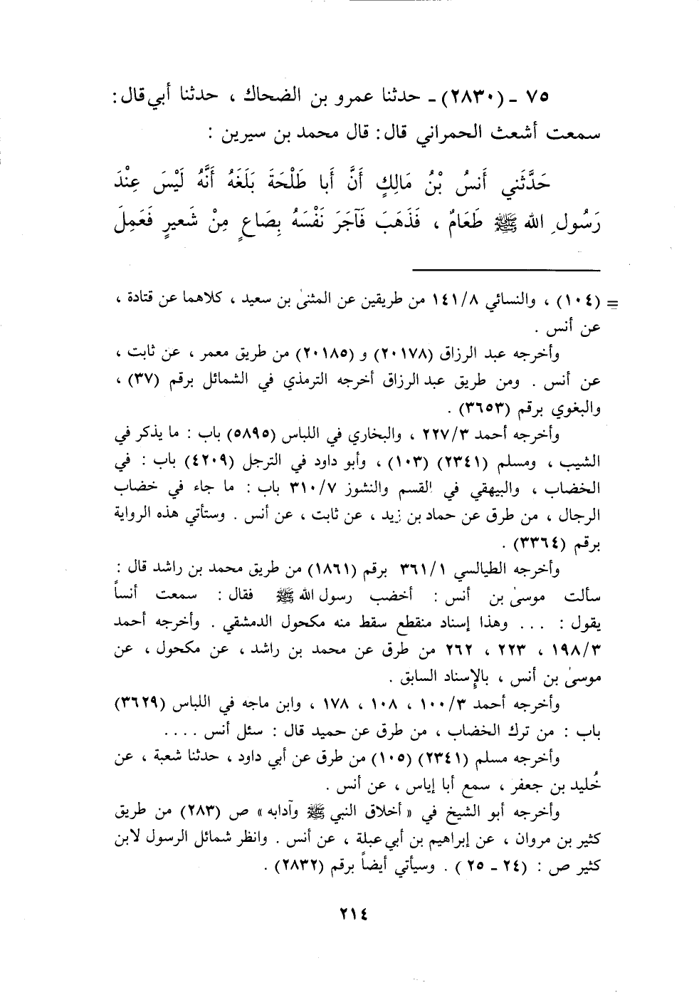 2830 - حَدَّثَنَا عَمْرُو بْنُ الضَّحَّاكِ، حَدَّثَنَا أَبِي، قَالَ: سَمِعْتُ أَشْعَثَ الْحُمْرَانِيَّ، قَالَ: قَالَ مُحَمَّدُ بْنُ سِيرِينَ، حَدَّثَنِي أَنَسُ بْنُ مَالِكٍ، أَنَّ أَبَا طَلْحَةَ، بَلَغَهُ أَنَّهُ لَيْسَ عِنْدَ رَسُولِ اللَّهِ صَلَّى اللهُ عَلَيْهِ وَسَلَّمَ طَعَامٌ، فَذَهَبَ فَآجَرَ نَفْسَهُ بِصَاعٍ مِنْ شَعِيرٍ فَعَمِلَ -[215]- يَوْمَهُ ذَلِكَ، فَجَاءَ بِهِ، فَقَالَ: اخْبِزِي هَذَا، فَقَالَ: إِنَّهُ شَعِيرٌ، وَلَكِنِ اجْعَلِيهِ خَطِيفَةً، فَجَعَلَتْهُ، فَبَعَثَ أَنَسَ بْنَ مَالِكٍ، فَقَالَ: اذْهَبْ إِلَى رَسُولِ اللَّهِ صَلَّى اللهُ عَلَيْهِ وَسَلَّمَ فَقُلْ لَهُ فِيمَا بَيْنَكَ وَبَيْنَهُ، فَأَتَى رَسُولَ اللَّهِ صَلَّى اللهُ عَلَيْهِ وَسَلَّمَ وَمَعَهُ أَصْحَابُهُ، فَقَالَ: «الطَّعَامُ» قَالَ: نَعَمْ، قَالَ: «قُومُوا» فَقَامُوا، فَلَمَّا أَتَى أَنَسٌ أَبَا طَلْحَةَ قَالَ: قُلْتُ هَذَا، قَالَ: «الطَّعَامُ؟» فَكَرِهْتُ أَنْ أَكْذِبَ، فَقَامَ رَسُولُ اللَّهِ صَلَّى اللهُ عَلَيْهِ وَسَلَّمَ §فَدَعَا عَشَرَةً، فَدَخَلُوا فَأَكَلُوا حَتَّى شَبِعُوا، ثُمَّ دَعَا عَشَرَةً فَدَخَلُوا فَأَكَلُوا حَتَّى شَبِعُوا، ثُمَّ دَعَا عَشَرَةً فَدَخَلُوا فَأَكَلُوا حَتَّى شَبِعُوا، ثُمَّ بَقِيَ لِأَهْلِهِ مَا يَشْبَعُونَ مِنْهُ "Kإسناده صحيح