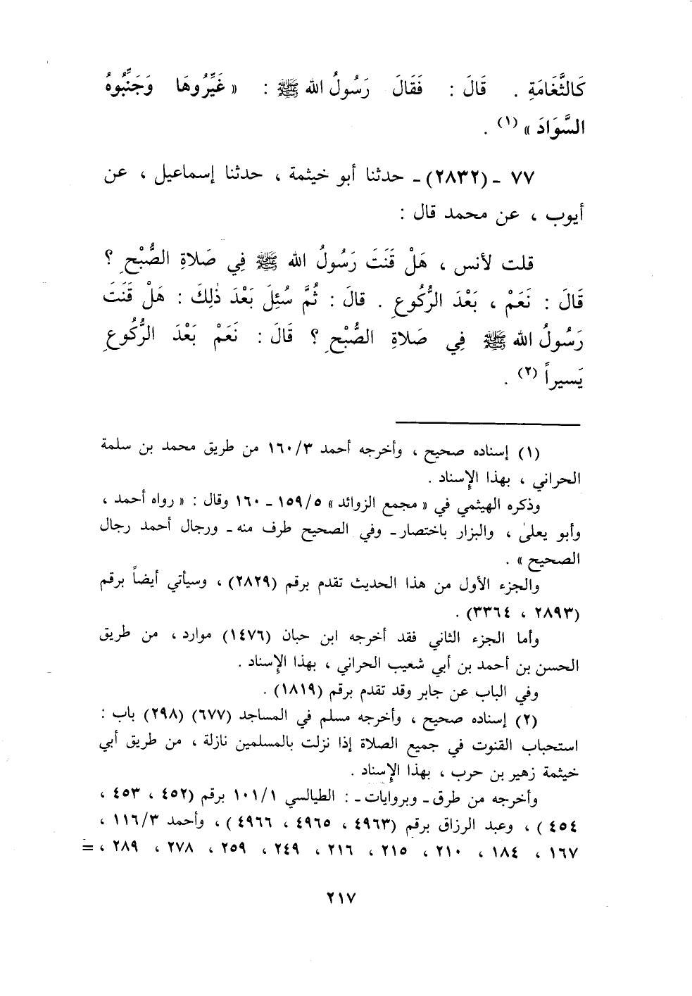 2832 - حَدَّثَنَا أَبُو خَيْثَمَةَ، حَدَّثَنَا إِسْمَاعِيلُ، عَنْ أَيُّوبَ، عَنْ مُحَمَّدٍ، قَالَ: قُلْتُ لِأَنَسٍ: §هَلْ قَنَتَ رَسُولُ اللَّهِ صَلَّى اللهُ عَلَيْهِ وَسَلَّمَ فِي صَلَاةِ الصُّبْحِ؟ قَالَ: «نَعَمْ، بَعْدَ الرُّكُوعِ»، قَالَ: ثُمَّ سُئِلَ بَعْدَ ذَلِكَ: هَلْ قَنَتَ رَسُولُ اللَّهِ صَلَّى اللهُ عَلَيْهِ وَسَلَّمَ فِي صَلَاةِ الصُّبْحِ؟ قَالَ: «نَعَمْ، بَعْدَ الرُّكُوعِ يَسِيرًا» Kإسناده صحيح