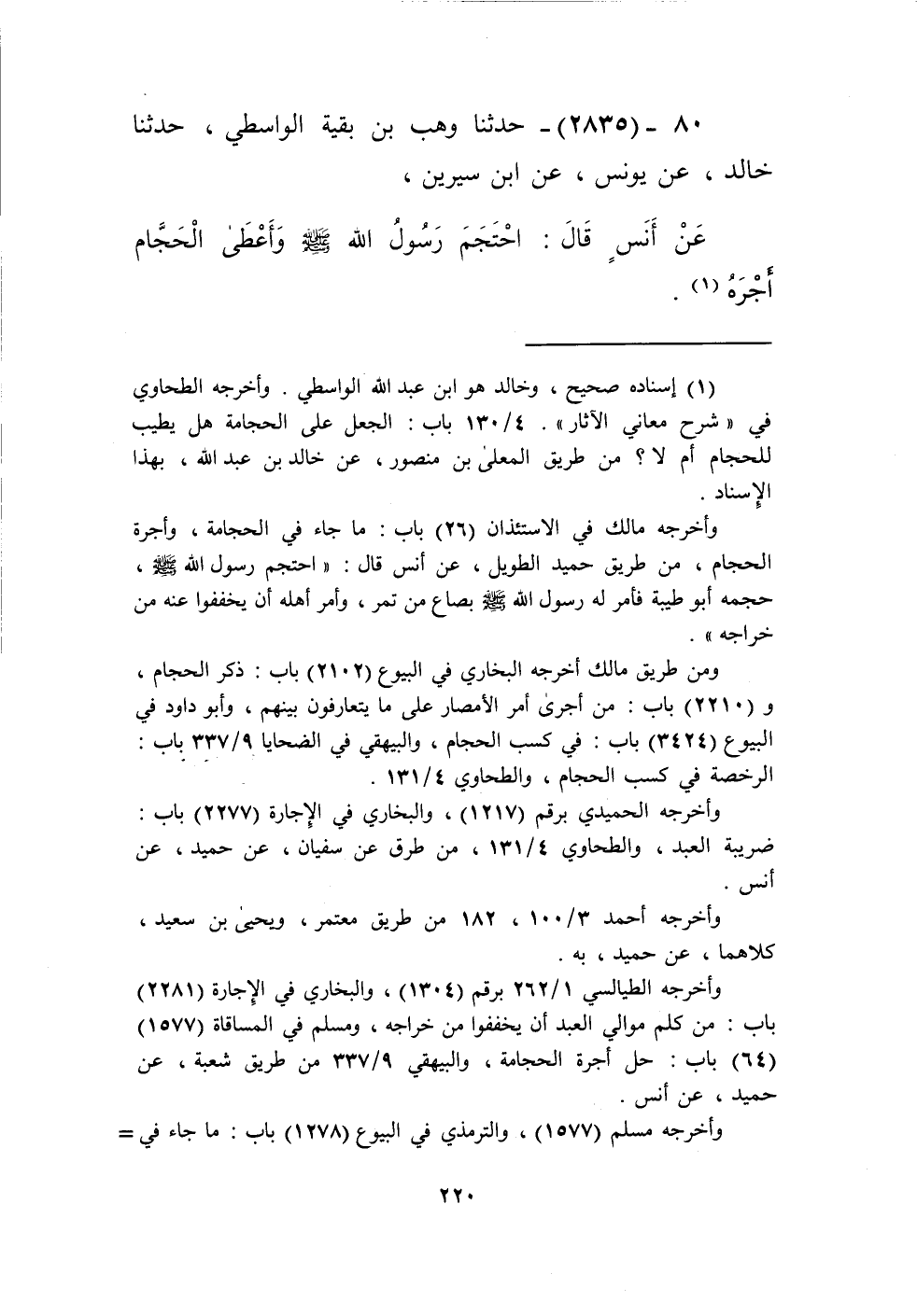 2835 - حَدَّثَنَا وَهْبُ بْنُ بَقِيَّةَ الْوَاسِطِيُّ، حَدَّثَنَا خَالِدٌ، عَنْ يُونُسَ، عَنِ ابْنِ سِيرِينَ، عَنْ أَنَسٍ، قَالَ: «§احْتَجَمَ رَسُولُ اللَّهِ صَلَّى اللهُ عَلَيْهِ وَسَلَّمَ، وَأَعْطَى الْحَجَّامَ أَجْرَهُ» Kإسناده صحيح