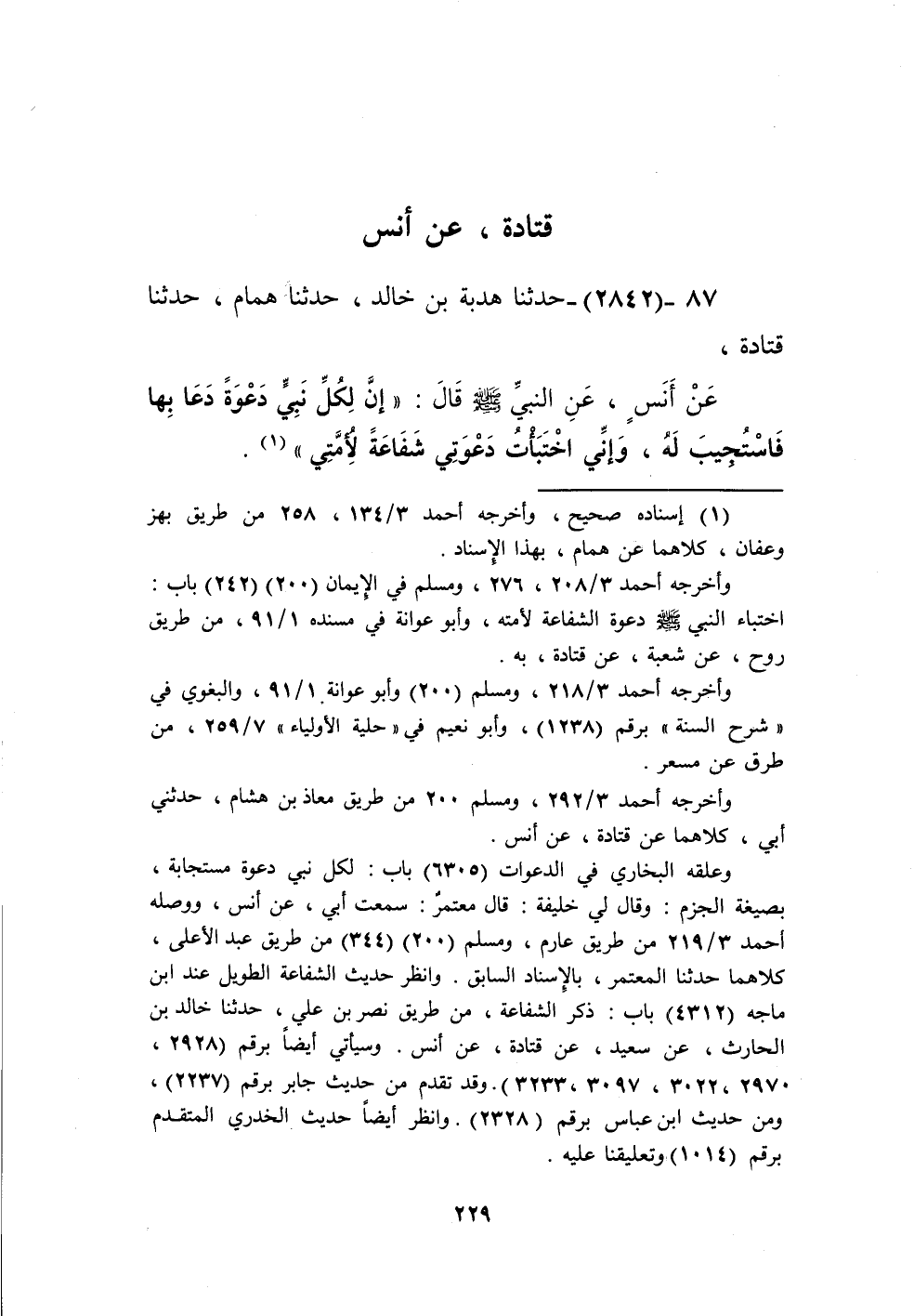 2842 - حَدَّثَنَا هُدْبَةُ بْنُ خَالِدٍ، حَدَّثَنَا هَمَّامٌ، حَدَّثَنَا قَتَادَةُ، عَنْ أَنَسٍ، عَنِ النَّبِيِّ صَلَّى اللهُ عَلَيْهِ وَسَلَّمَ قَالَ: «إِنَّ §لِكُلِّ نَبِيٍّ دَعْوَةً دَعَا بِهَا فَاسْتُجِيبَ لَهُ، وَإِنِّي اخْتَبَأْتُ دَعْوَتِي شَفَاعَةً لِأُمَّتِي» Kإسناده صحيح