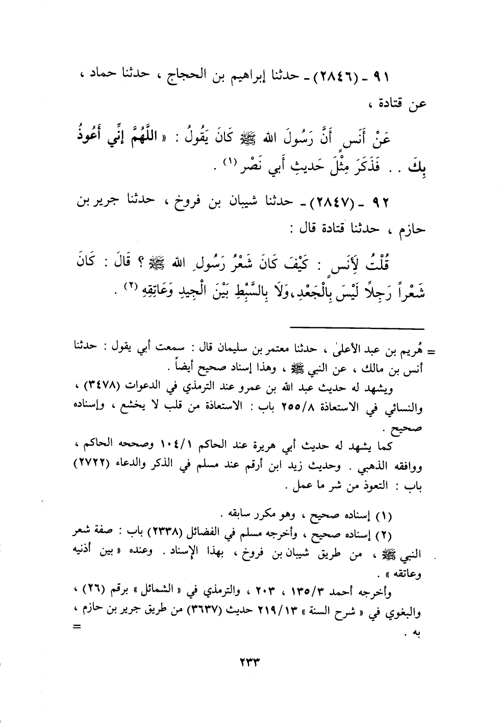2847 - حَدَّثَنَا شَيْبَانُ بْنُ فَرُّوخَ، حَدَّثَنَا جَرِيرُ بْنُ حَازِمٍ، حَدَّثَنَا قَتَادَةُ، قَالَ: قُلْتُ لِأَنَسٍ: كَيْفَ كَانَ شَعْرُ رَسُولِ اللَّهِ صَلَّى اللهُ عَلَيْهِ وَسَلَّمَ قَالَ: «§كَانَ شَعْرًا رَجِلًا لَيْسَ بِالْجَعْدِ، وَلَا بِالسَّبْطِ بَيْنَ الْجِيدِ وَعَاتِقِهِ» Kإسناده صحيح
