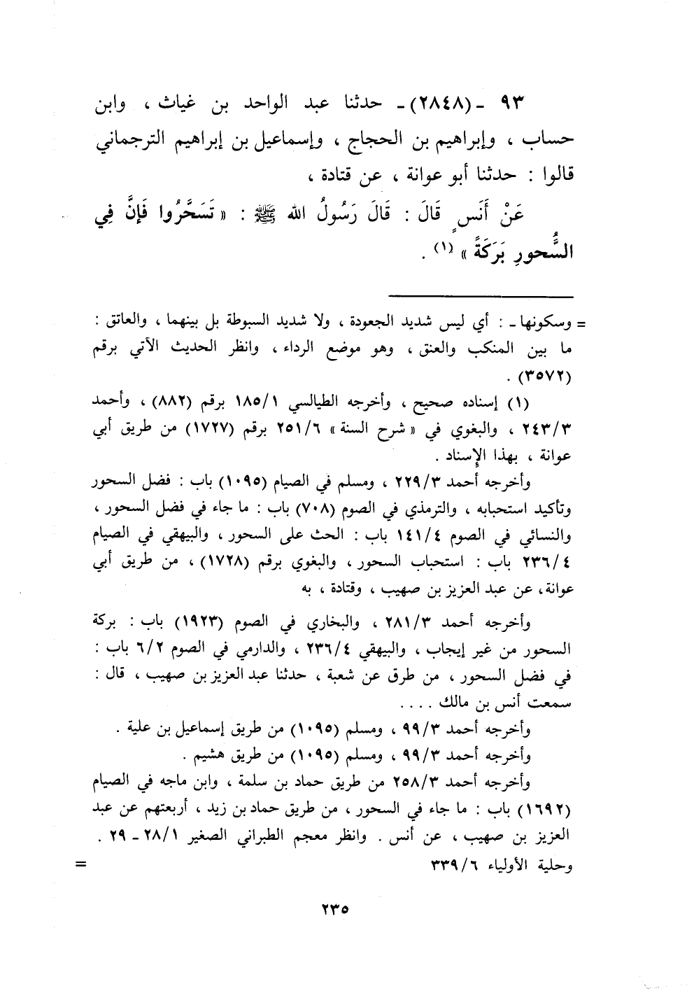 2848 - حَدَّثَنَا عَبْدُ الْوَاحِدِ بْنُ غِيَاثٍ، وَابْنُ حِسَابٍ، وَإِبْرَاهِيمُ بْنُ الْحَجَّاجِ، وَإِسْمَاعِيلُ بْنُ إِبْرَاهِيمَ التَّرْجُمَانِيُّ، قَالُوا: حَدَّثَنَا أَبُو عَوَانَةَ، عَنْ قَتَادَةَ، عَنْ أَنَسٍ، قَالَ: قَالَ رَسُولُ اللَّهِ صَلَّى اللهُ عَلَيْهِ وَسَلَّمَ: «§تَسَحَّرُوا فَإِنَّ فِي السَّحُورِ بَرَكَةً» Kإسناده صحيح