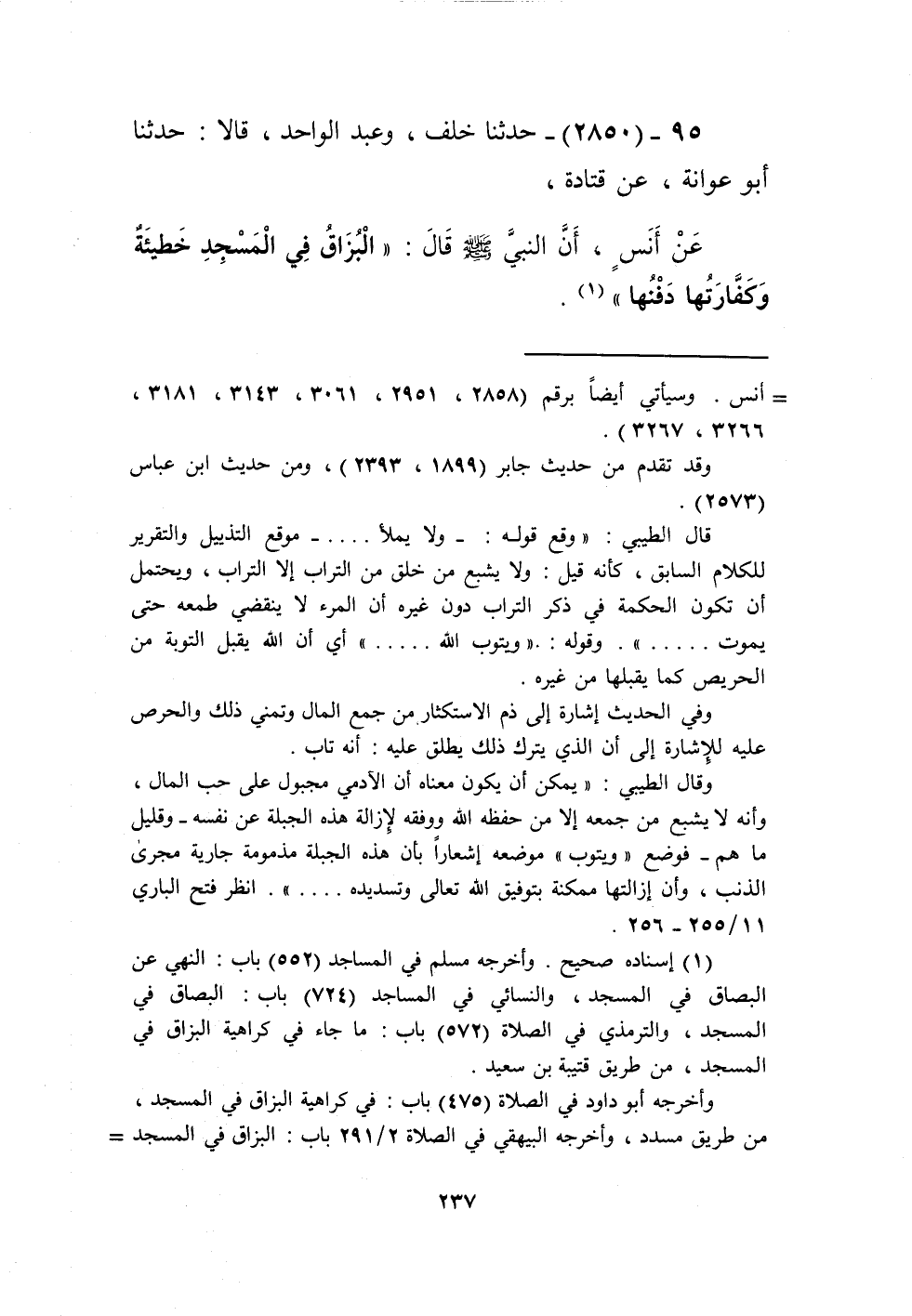 2850 - حَدَّثَنَا خَلَفٌ، وَعَبْدُ الْوَاحِدِ، قَالَا: حَدَّثَنَا أَبُو عَوَانَةَ، عَنْ قَتَادَةَ، عَنْ أَنَسٍ، أَنَّ النَّبِيَّ صَلَّى اللهُ عَلَيْهِ وَسَلَّمَ قَالَ: «§الْبُزَاقُ فِي الْمَسْجِدِ خَطِيئَةٌ وَكَفَّارَتُهَا دَفْنُهَا» Kإسناده صحيح