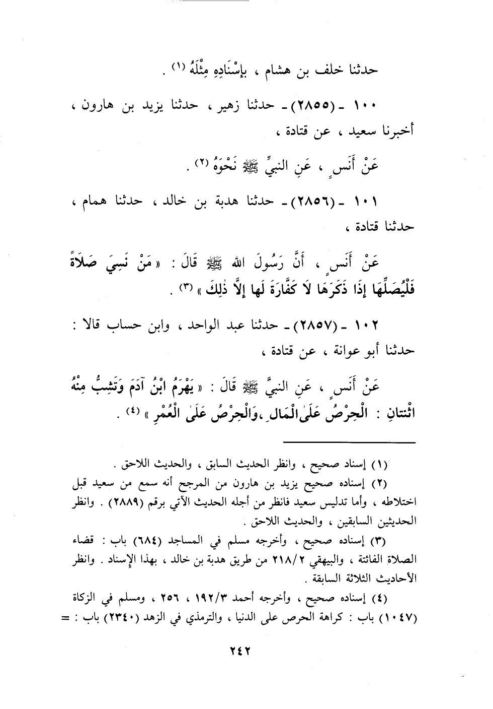 2857 - حَدَّثَنَا عَبْدُ الْوَاحِدِ، وَابْنُ حِسَابٍ، قَالَا: حَدَّثَنَا أَبُو عَوَانَةَ، عَنْ قَتَادَةَ، عَنْ أَنَسٍ، عَنِ النَّبِيِّ صَلَّى اللهُ عَلَيْهِ وَسَلَّمَ قَالَ: " §يَهْرَمُ ابْنُ آدَمَ وَتَشِبُّ مِنْهُ اثْنَتَانِ: الْحِرْصُ عَلَى الْمَالِ، وَالْحِرْصُ عَلَى الْعُمْرِ "Kإسناده صحيح