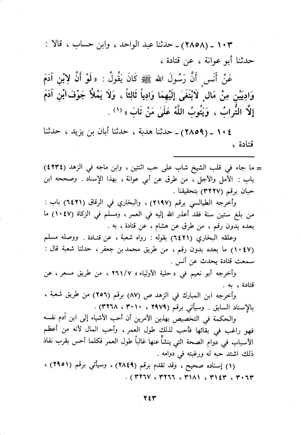 2858 - حَدَّثَنَا عَبْدُ الْوَاحِدِ، وَابْنُ حِسَابٍ، قَالَا: حَدَّثَنَا أَبُو عَوَانَةَ، عَنْ قَتَادَةَ، عَنْ أَنَسٍ: أَنَّ رَسُولَ اللَّهِ صَلَّى اللهُ عَلَيْهِ وَسَلَّمَ كَانَ يَقُولُ: «§لَوْ أَنَّ لِابْنِ آدَمَ وَادِيَيْنِ مِنْ مَالٍ لَابْتَغَى إِلَيْهِمَا وَادِيًا ثَالِثًا، وَلَا يَمْلَأُ جَوْفَ ابْنَ آدَمَ إِلَّا التُّرَابُ، وَيَتُوبُ اللَّهُ عَلَى مَنْ تَابَ» Kإسناده صحيح
