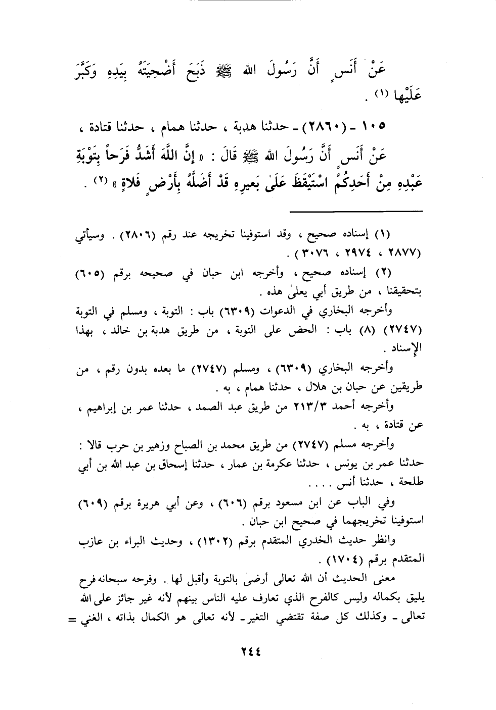 2860 - حَدَّثَنَا هُدْبَةُ، حَدَّثَنَا هَمَّامٌ، حَدَّثَنَا قَتَادَةُ، عَنْ أَنَسٍ، أَنَّ رَسُولَ اللَّهِ صَلَّى اللهُ عَلَيْهِ وَسَلَّمَ قَالَ: «إِنَّ §اللَّهَ أَشَدُّ فَرَحًا بِتَوْبَةِ عَبْدِهِ مِنْ أَحَدِكُمُ اسْتَيْقَظَ عَلَى بَعِيرِهِ قَدْ أَضَلَّهُ بِأَرْضٍ فَلَاةٍ» Kإسناده صحيح