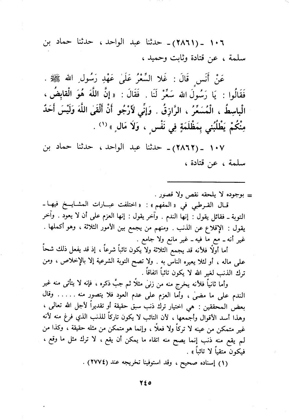2861 - حَدَّثَنَا عَبْدُ الْوَاحِدِ، حَدَّثَنَا حَمَّادُ بْنُ سَلَمَةَ، عَنْ قَتَادَةَ، وَثَابِتٍ، وَحُمَيْدٍ، عَنْ أَنَسٍ، قَالَ: غَلَا السِّعْرُ عَلَى عَهْدِ رَسُولِ اللَّهِ صَلَّى اللهُ عَلَيْهِ وَسَلَّمَ فَقَالُوا يَا رَسُولَ اللَّهِ: سَعِّرْ لَنَا، فَقَالَ: «إِنَّ §اللَّهَ هُوَ الْقَابِضُ، الْبَاسِطُ، الْمُسَعِّرُ الرَّازِقُ، وَإِنِّي لَأَرْجُو أَنْ أَلْقَى اللَّهَ وَلَيْسَ أَحَدٌ مِنْكُمْ يَطْلُبُنِي بِمَظْلِمَةٍ فِي نَفْسٍ وَلَا مَالٍ» Kإسناده صحيح