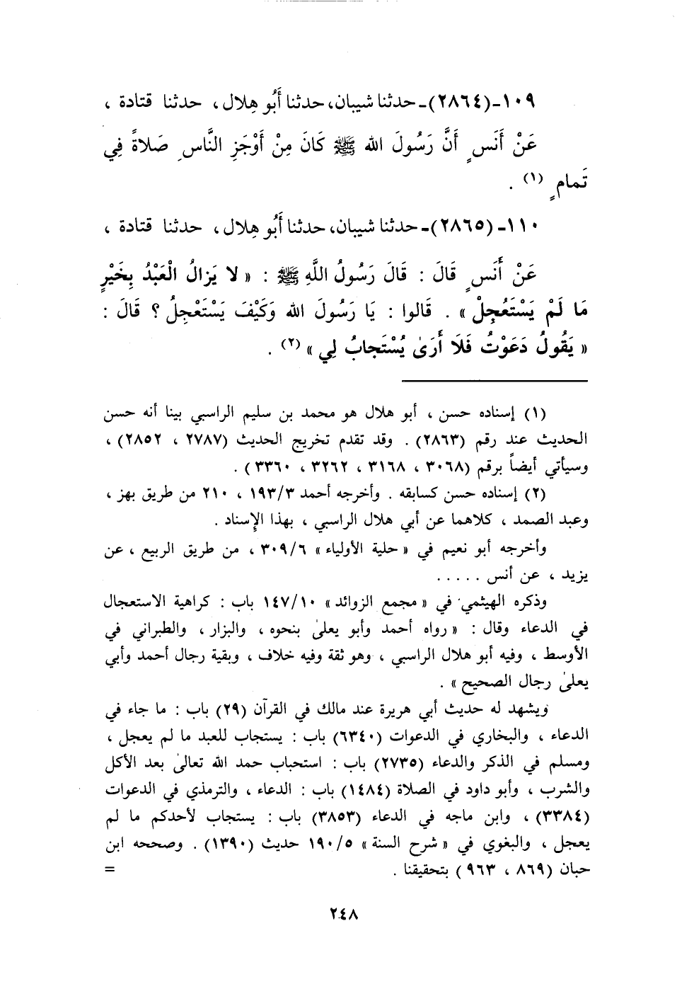 2865 - حَدَّثَنَا شَيْبَانُ، حَدَّثَنَا أَبُو هِلَالٍ، حَدَّثَنَا قَتَادَةُ، عَنْ أَنَسٍ، قَالَ: قَالَ رَسُولُ اللَّهِ صَلَّى اللهُ عَلَيْهِ وَسَلَّمَ: «§لَا يَزَالُ الْعَبْدُ بِخَيْرٍ مَا لَمْ يَسْتَعْجِلْ» قَالُوا يَا رَسُولَ اللَّهِ: وَكَيْفَ يَسْتَعْجِلُ، قَالَ: «يَقُولُ دَعَوْتُ فَلَا أَرَى يُسْتَجَابُ لِي» Kإسناده حسن