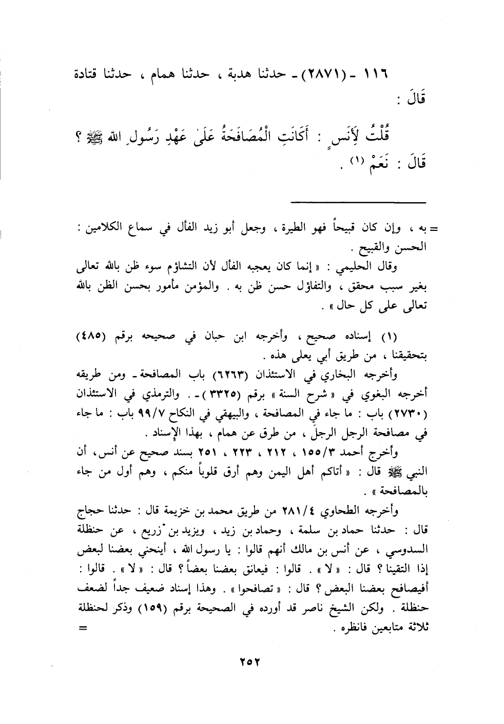 2871 - حَدَّثَنَا هُدْبَةُ، حَدَّثَنَا هَمَّامٌ، حَدَّثَنَا قَتَادَةُ، قَالَ: قُلْتُ لِأَنَسٍ: §أَكَانَتِ الْمُصَافَحَةُ عَلَى عَهْدِ رَسُولِ اللَّهِ صَلَّى اللهُ عَلَيْهِ وَسَلَّمَ؟ قَالَ: «نَعَمْ»، قَالَ قَتَادَةُ: وَكَانَ الْحَسَنُ يُصَافِحُKإسناده صحيح