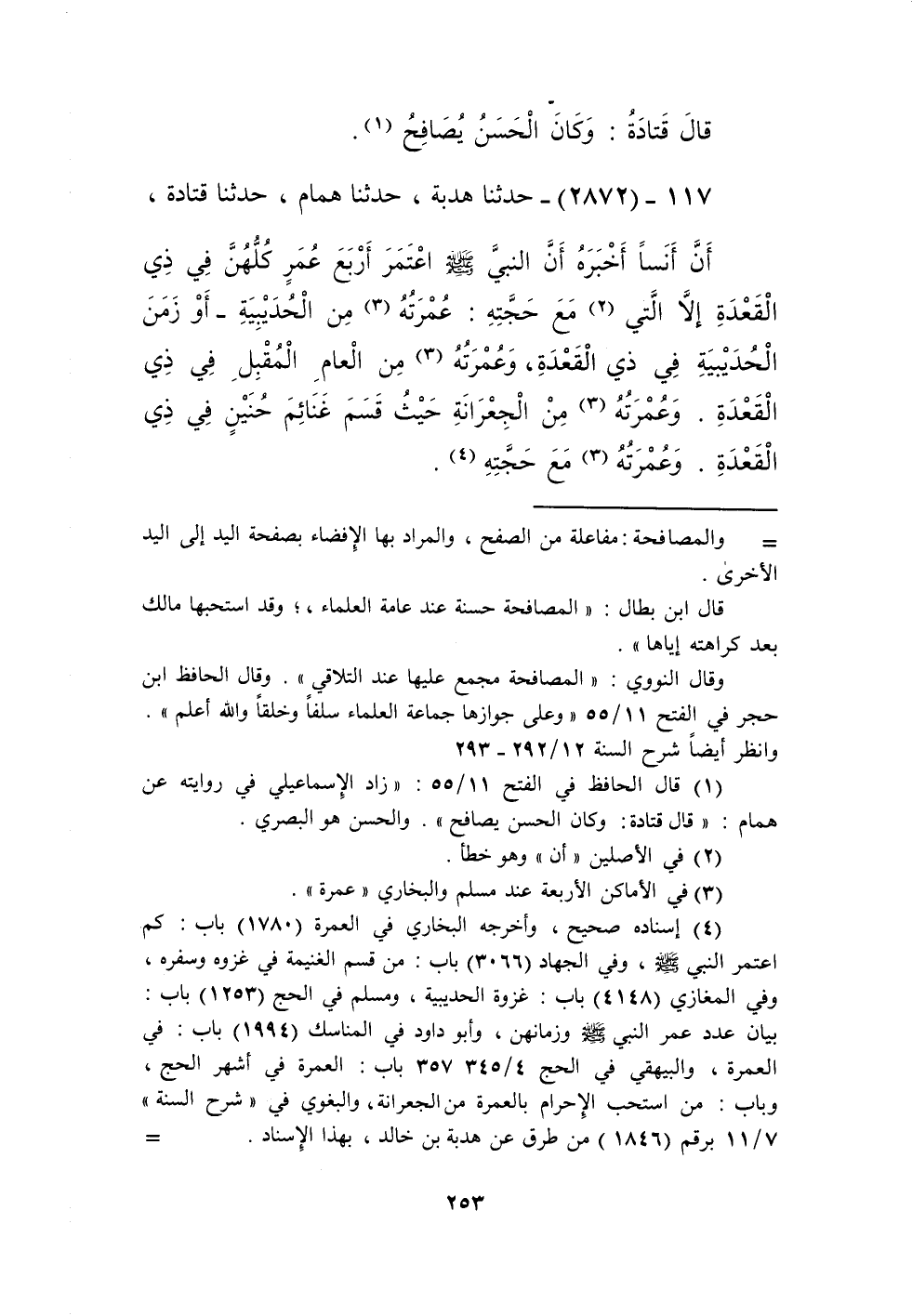 2872 - حَدَّثَنَا هُدْبَةُ، حَدَّثَنَا هَمَّامٌ، حَدَّثَنَا قَتَادَةُ، أَنَّ أَنَسًا، أَخْبَرَهُ " أَنَّ النَّبِيَّ صَلَّى اللهُ عَلَيْهِ وَسَلَّمَ §اعْتَمَرَ أَرْبَعَ عُمَرٍ كُلُّهُنَّ فِي ذِي الْقَعْدَةِ إِلَّا الَّتِي مَعَ حَجَّتِهِ: عُمْرَتُهُ مِنَ الْحُدَيْبِيَةِ، أَوْ زَمَنَ الْحُدَيْبِيَةِ فِي ذِي الْقَعْدَةِ، وَعُمْرَتُهُ مِنَ الْعَامِ الْمُقْبِلِ فِي ذِي الْقَعْدَةِ، وَعُمْرَتُهُ مِنَ الْجِعِرَّانَةِ حَيْثُ قَسَمَ غَنَائِمَ حُنَيْنٍ فِي ذِي الْقَعْدَةِ، وَعُمْرَتُهُ مَعَ حَجَّتِهِ "Kإسناده صحيح