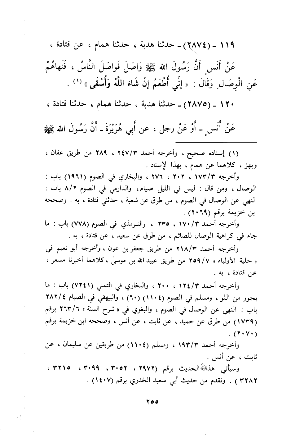 2874 - حَدَّثَنَا هُدْبَةُ، حَدَّثَنَا هَمَّامٌ، عَنْ قَتَادَةَ، عَنْ أَنَسٍ، أَنَّ رَسُولَ اللَّهِ صَلَّى اللهُ عَلَيْهِ وَسَلَّمَ وَاصَلَ فَوَاصَلَ النَّاسُ فَنَهَاهُمْ عَنِ الْوِصَالِ، وَقَالَ: «§إِنِّي أُطْعَمُ إِنْ شَاءَ اللَّهُ وَأُسْقَى» Kإسناده صحيح