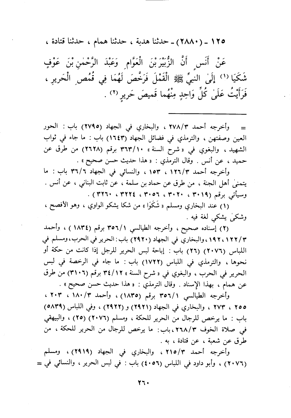 2880 - حَدَّثَنَا هُدْبَةُ، حَدَّثَنَا هَمَّامٌ، حَدَّثَنَا قَتَادَةُ، عَنْ أَنَسٍ، أَنَّ الزُّبَيْرَ بْنَ الْعَوَّامِ، وَعَبْدَ الرَّحْمَنِ بْنَ عَوْفٍ، شَكَيَا إِلَى النَّبِيِّ صَلَّى اللهُ عَلَيْهِ وَسَلَّمَ الْقَمْلَ «§فَرَخَّصَ لَهُمَا فِي قَمِيصِ الْحَرِيرِ»، فَرَأَيْتُ عَلَى كُلِّ وَاحِدٍ مِنْهُمَا قَمِيصَ حَرِيرٍKإسناده صحيح