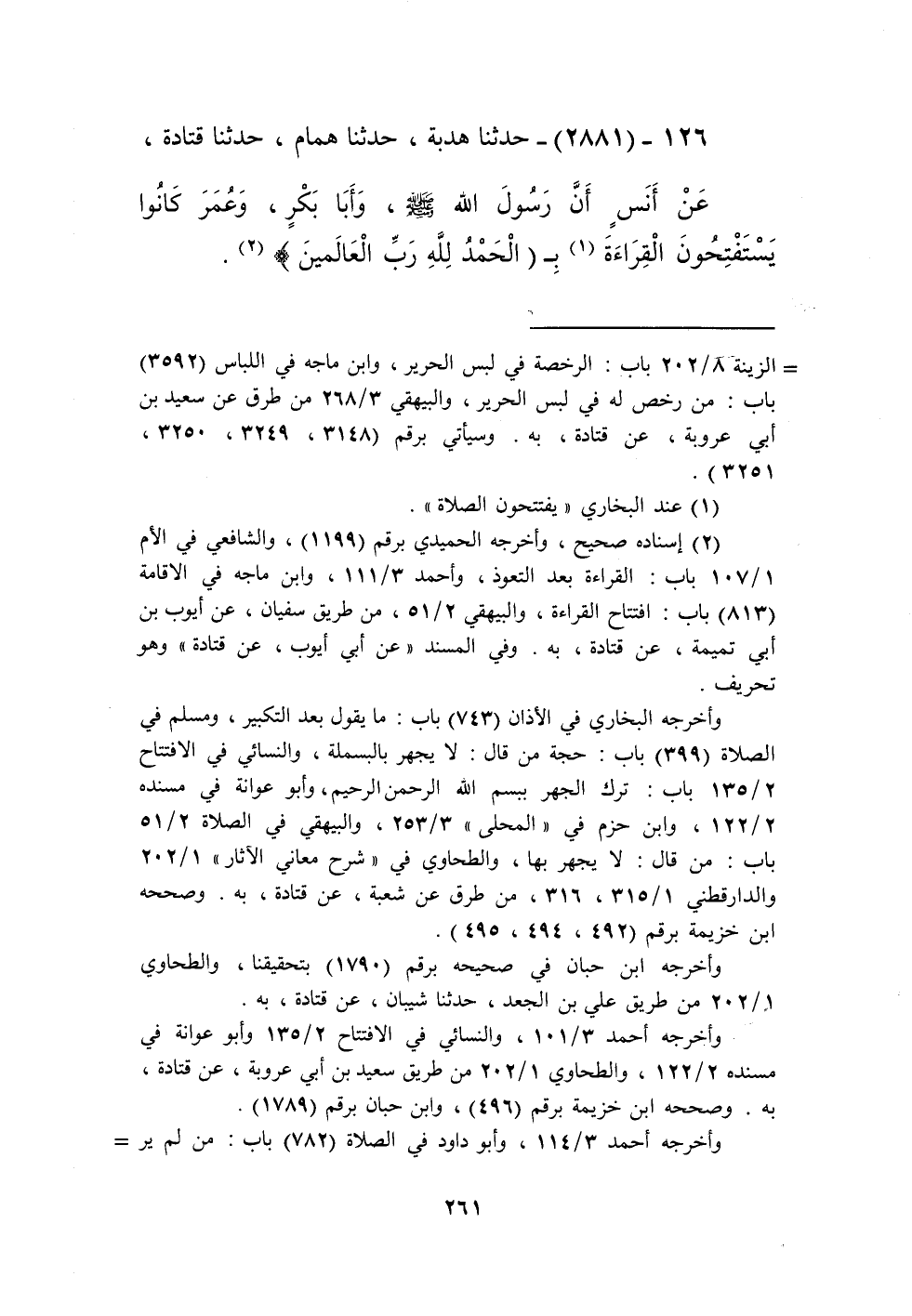 2881 - حَدَّثَنَا هُدْبَةُ، حَدَّثَنَا هَمَّامٌ، حَدَّثَنَا قَتَادَةُ، عَنْ أَنَسٍ، " أَنَّ رَسُولَ اللَّهِ صَلَّى اللهُ عَلَيْهِ وَسَلَّمَ وَأَبَا بَكْرٍ وَعُمَرَ كَانُوا §يَسْتَفْتِحُونَ الْقِرَاءَةَ بِالْحَمْدُ لِلَّهِ رَبِّ الْعَالَمِينَKإسناده صحيح