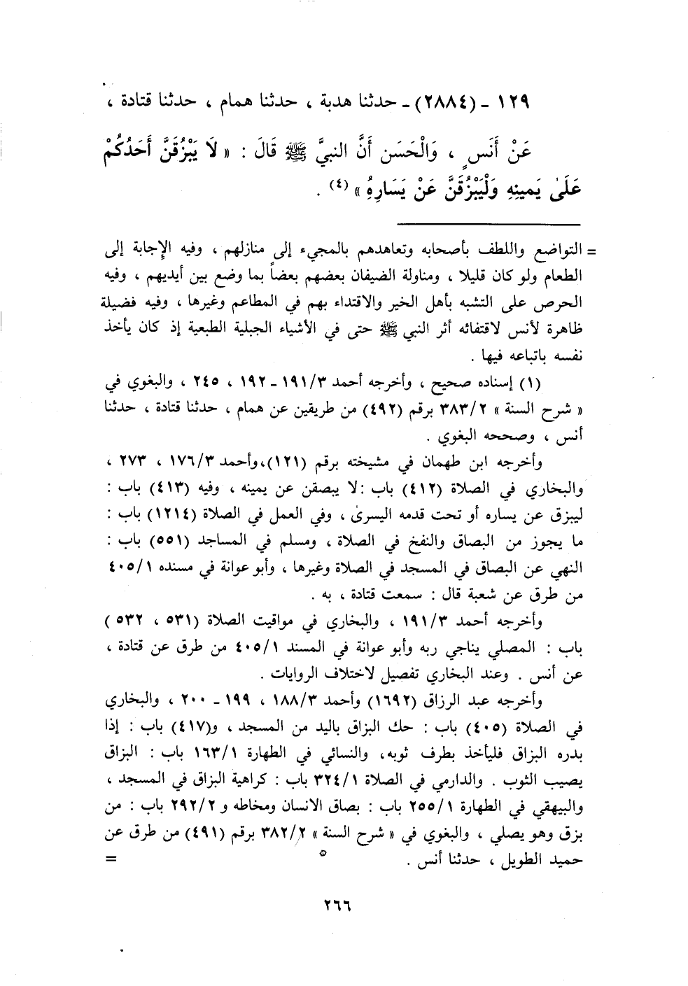 2884 - حَدَّثَنَا هُدْبَةُ، حَدَّثَنَا هَمَّامٌ، حَدَّثَنَا قَتَادَةُ، عَنْ أَنَسٍ، وَالْحَسَنِ، أَنَّ النَّبِيَّ صَلَّى اللهُ عَلَيْهِ وَسَلَّمَ قَالَ: «§لَا يَبْزُقَنَّ أَحَدُكُمْ عَنْ يَمِينِهِ، وَلْيَبْزُقَنَّ عَنْ يَسَارِهِ» Kإسناده صحيح