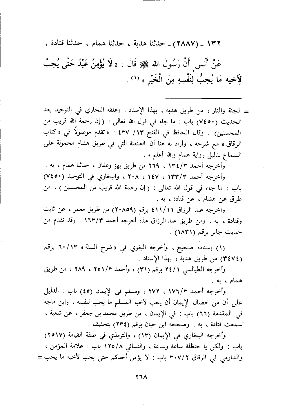 2887 - حَدَّثَنَا هُدْبَةُ، حَدَّثَنَا هَمَّامٌ، حَدَّثَنَا قَتَادَةُ، عَنْ أَنَسٍ، أَنَّ رَسُولَ اللَّهِ صَلَّى اللهُ عَلَيْهِ وَسَلَّمَ قَالَ: «§لَا يُؤْمِنُ عَبْدٌ حَتَّى يُحِبَّ لِأَخِيهِ مَا يُحِبُّ لِنَفْسِهِ مِنَ الْخَيْرِ» Kإسناده صحيح