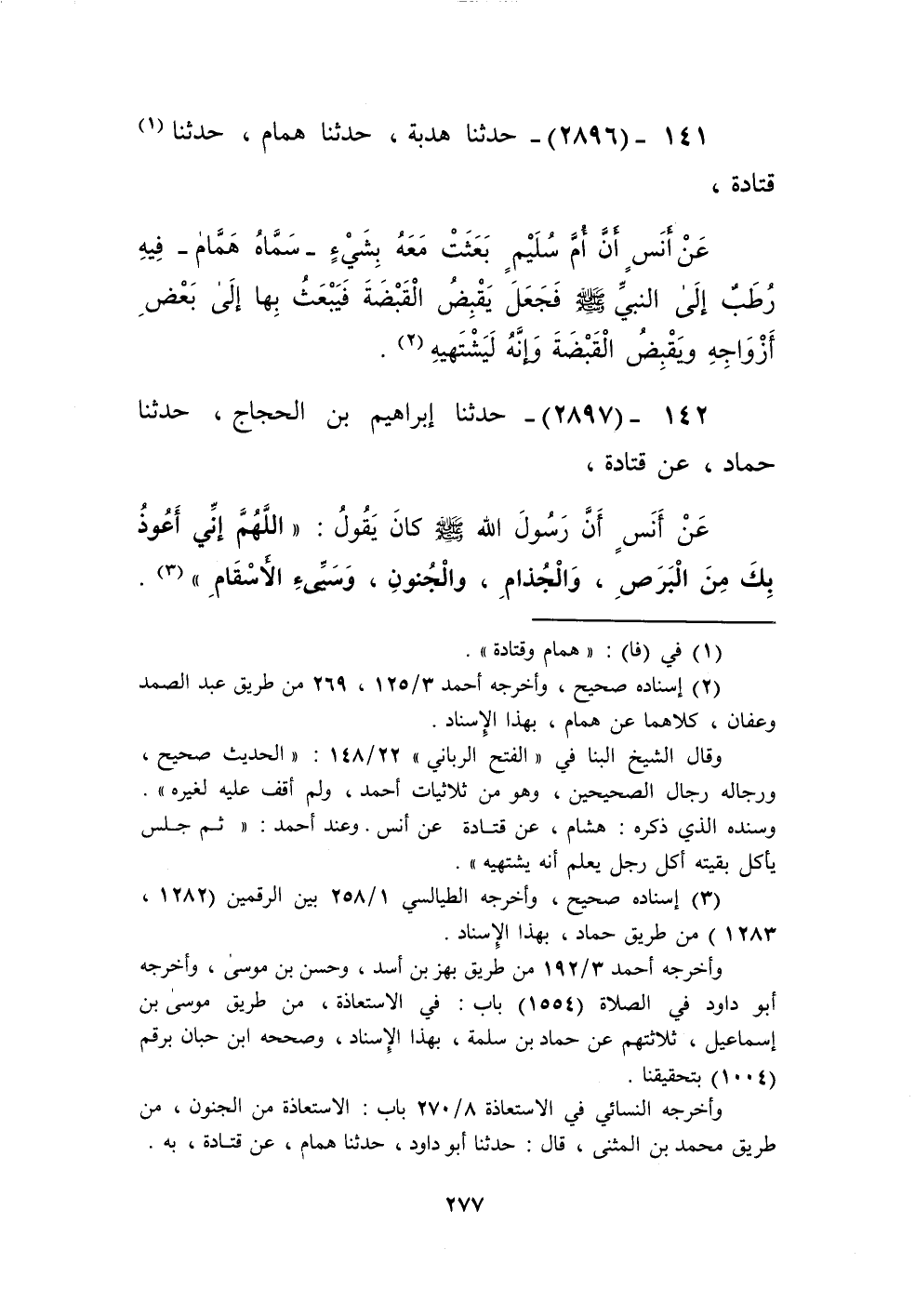 2897 - حَدَّثَنَا إِبْرَاهِيمُ بْنُ الْحَجَّاجِ، حَدَّثَنَا حَمَّادٌ، عَنْ قَتَادَةَ، عَنْ أَنَسٍ، أَنَّ رَسُولَ اللَّهِ صَلَّى اللهُ عَلَيْهِ وَسَلَّمَ كَانَ يَقُولُ: «§اللَّهُمَّ إِنِّي أَعُوذُ بِكَ مِنَ الْبَرَصِ وَالْجُذَامِ وَالْجُنُونِ وَسيِّئِ الْأَسْقَامِ» Kإسناده صحيح