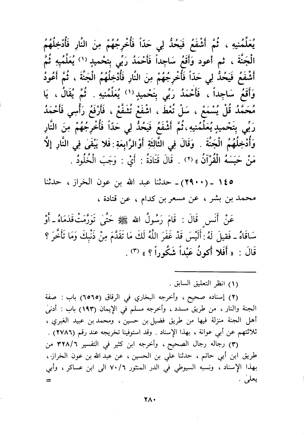 2900 - حَدَّثَنَا عَبْدُ اللَّهِ بْنُ عَوْنٍ الْخَرَّازُ، حَدَّثَنَا مُحَمَّدُ بْنُ بِشْرٍ، عَنْ مِسْعَرِ بْنِ كِدَامٍ، عَنْ قَتَادَةَ، عَنْ أَنَسٍ، قَالَ: قَامَ رَسُولُ اللَّهِ صَلَّى اللهُ عَلَيْهِ وَسَلَّمَ حَتَّى تَوَرَّمَتْ قَدَمَاهُ أَوْ سَاقَاهُ، فَقِيلَ لَهُ: أَلَيْسَ قَدْ غَفَرَ اللَّهُ لَكَ مَا تَقَدَّمَ مِنْ ذَنْبِكَ وَمَا تَأَخَّرَ، قَالَ: «§أَفَلَا أَكُونُ عَبْدًا شَكُورًا» Kرجاله رجال الصحيح