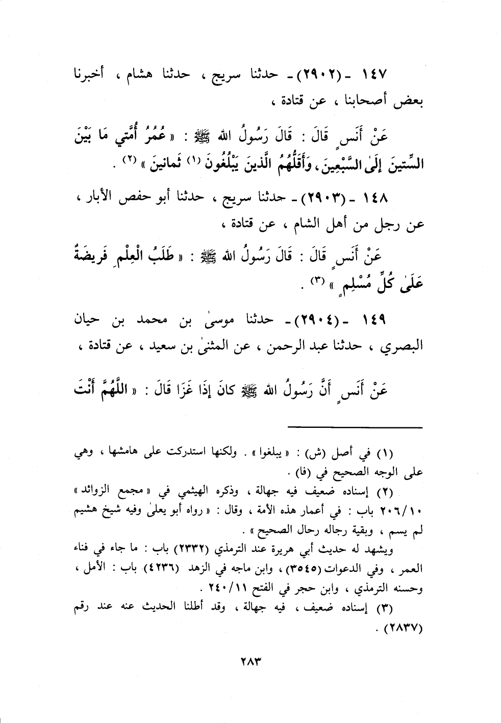 2903 - حَدَّثَنَا سُرَيْجٌ، حَدَّثَنَا أَبُو حَفْصٍ الْأَبَّارُ، عَنْ رَجُلٍ مِنْ أَهْلِ الشَّامِ، عَنْ قَتَادَةَ، عَنْ أَنَسٍ، قَالَ: قَالَ رَسُولُ اللَّهِ صَلَّى اللهُ عَلَيْهِ وَسَلَّمَ: «§طَلَبُ الْعِلْمِ فَرِيضَةٌ عَلَى كُلِّ مُسْلِمٍ» Kإسناده ضعيف