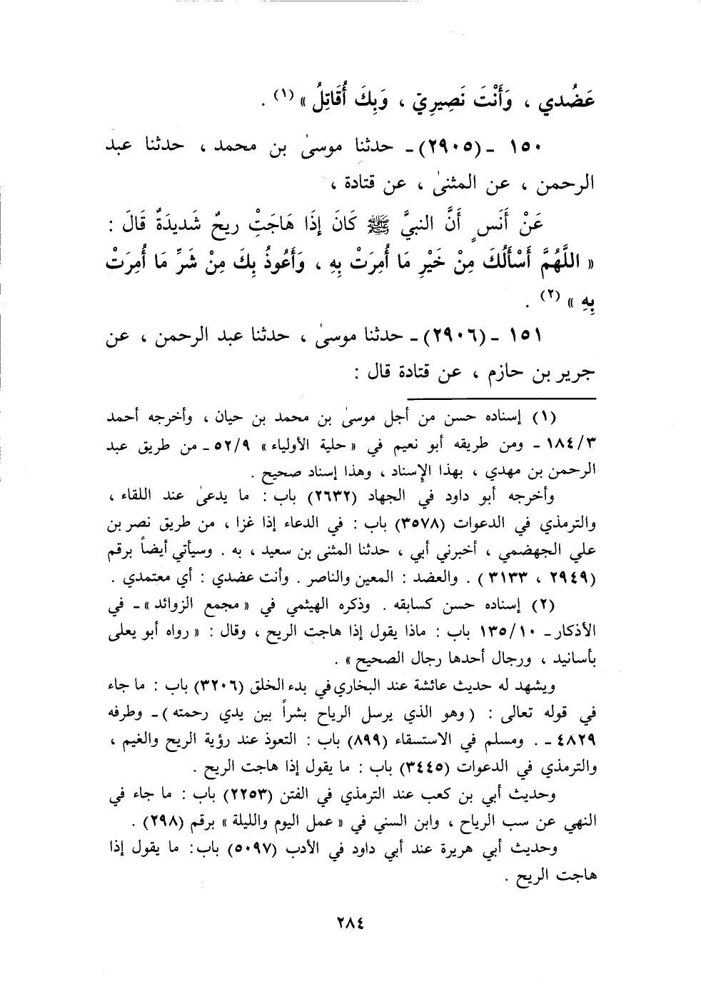 2905 - حَدَّثَنَا مُوسَى بْنُ مُحَمَّدٍ، حَدَّثَنَا عَبْدُ الرَّحْمَنِ، عَنِ الْمُثَنَّى، عَنْ قَتَادَةَ، عَنْ أَنَسٍ، أَنَّ النَّبِيَّ صَلَّى اللهُ عَلَيْهِ وَسَلَّمَ كَانَ إِذَا هَاجَتْ رِيحٌ شَدِيدَةٌ، قَالَ: «§اللَّهُمَّ أَسْأَلُكَ مِنْ خَيْرِ مَا أُمِرَتْ بِهِ، وَأَعُوذُ بِكَ مِنْ شَرِّ مَا أُمِرَتْ بِهِ» Kإسناده حسن
