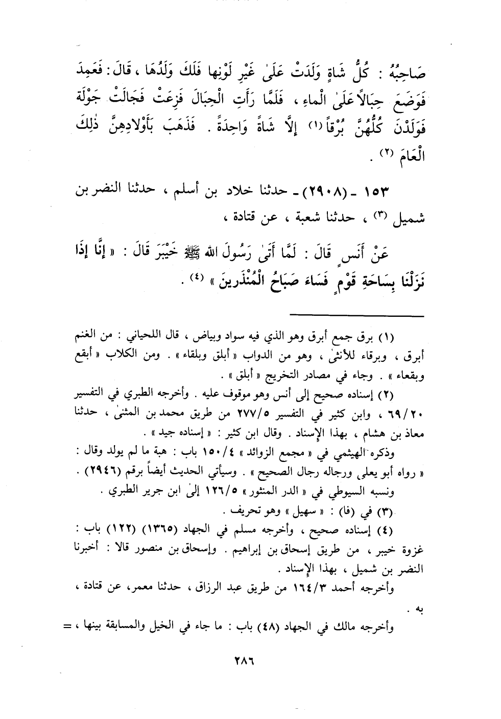 2908 - حَدَّثَنَا خَلَّادُ بْنُ أَسْلَمَ، حَدَّثَنَا النَّضْرُ بْنُ شُمَيْلٍ، حَدَّثَنَا شُعْبَةُ، عَنْ قَتَادَةَ، عَنْ أَنَسٍ، قَالَ: لَمَّا أَتَى رَسُولُ اللَّهِ صَلَّى اللهُ عَلَيْهِ وَسَلَّمَ خَيْبَرَ قَالَ: «§إِنَّا إِذَا نَزَلْنَا بِسَاحَةِ قَوْمٍ فُسَاءَ صَبَاحُ الْمُنْذَرِينَ» Kإسناده صحيح