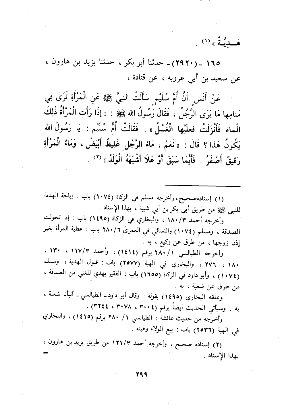 2920 - حَدَّثَنَا أَبُو بَكْرٍ، حَدَّثَنَا يَزِيدُ بْنُ هَارُونَ، عَنْ سَعِيدِ بْنِ أَبِي عَرُوبَةَ، عَنْ قَتَادَةَ، عَنْ أَنَسٍ: أَنَّ أُمَّ سُلَيْمٍ، سَأَلَتِ النَّبِيَّ صَلَّى اللهُ عَلَيْهِ وَسَلَّمَ عَنِ الْمَرْأَةِ تَرَى فِي مَنَامِهَا مَا يَرَى الرَّجُلُ، فَقَالَ رَسُولُ اللَّهِ صَلَّى اللهُ عَلَيْهِ وَسَلَّمَ: «§إِذَا رَأَتِ الْمَرْأَةُ ذَلِكَ الْمَاءَ فَأَنْزَلَتْ فَعَلَيْهَا الْغُسْلُ» فَقَالَتْ أُمُّ سُلَيْمٍ: يَا رَسُولَ اللَّهِ، يَكُونُ هَذَا؟ قَالَ: «نَعَمْ، مَاءُ الرَّجُلِ غَلِيظٌ أَبْيَضُ، وَمَاءُ الْمَرْأَةِ رَقِيقٌ أَصْفَرُ، فَأَيُّمَا سَبَقَ أَوْ عَلَا أَشْبَهَهُ الْوَلَدُ» Kإسناده صحيح