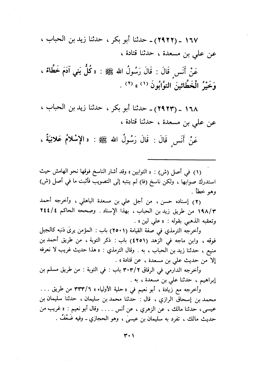 2922 - حَدَّثَنَا أَبُو بَكْرٍ، حَدَّثَنَا زَيْدُ بْنُ الْحُبَابِ، عَنْ عَلِيِّ بْنِ مَسْعَدَةَ، حَدَّثَنَا قَتَادَةُ، عَنْ أَنَسٍ، قَالَ: قَالَ رَسُولُ اللَّهِ صَلَّى اللهُ عَلَيْهِ وَسَلَّمَ: «§كُلُّ بَنِي آدَمَ خَطَّاءٌ، وَخَيْرُ الْخَطَّائِينَ التَّوَّابُونَ» Kإسناده حسن