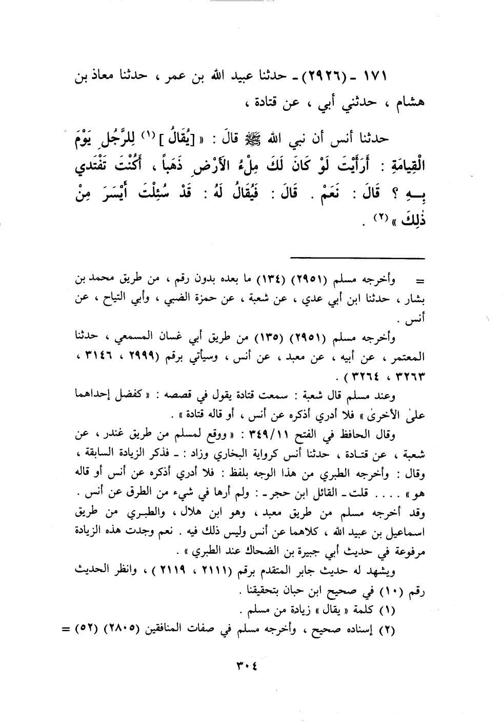 2926 - حَدَّثَنَا عُبَيْدُ اللَّهِ بْنُ عُمَرَ، حَدَّثَنَا مُعَاذُ بْنُ هِشَامٍ، حَدَّثَنِي أَبِي، عَنْ قَتَادَةَ، حَدَّثَنَا أَنَسٌ، أَنَّ نَبِيَّ اللَّهِ صَلَّى اللهُ عَلَيْهِ وَسَلَّمَ قَالَ: " §يُقَالُ لِلرَّجُلِ يَوْمَ الْقِيَامَةِ: أَرَأَيْتَ لَوْ كَانَ لَكَ مِلْءُ الْأَرْضِ ذَهَبًا أَكُنْتَ تَفْتَدِي بِهِ؟ قَالَ: نَعَمْ، قَالَ: فَيُقَالُ لَهُ: قَدْ سُئِلْتَ أَيْسَرَ مِنْ ذَلِكَ "Kإسناده صحيح