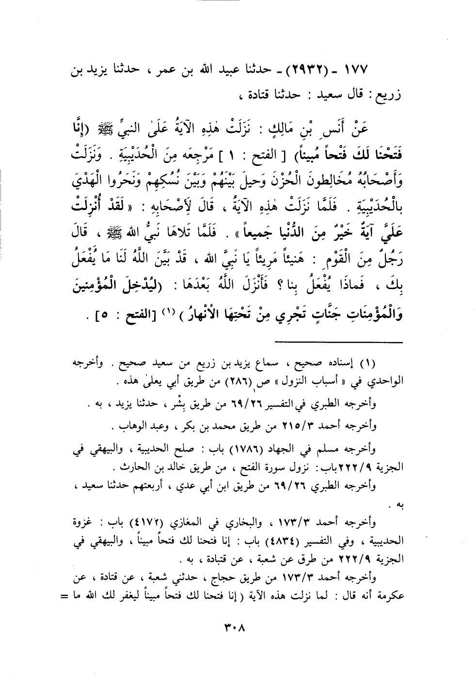 2932 - حَدَّثَنَا عُبَيْدُ اللَّهِ بْنُ عُمَرَ، حَدَّثَنَا يَزِيدُ بْنُ زُرَيْعٍ، قَالَ سَعِيدٌ: حَدَّثَنَا قَتَادَةُ، عَنْ أَنَسِ بْنِ مَالِكٍ، نَزَلَتْ هَذِهِ الْآيَةُ عَلَى النَّبِيِّ صَلَّى اللهُ عَلَيْهِ وَسَلَّمَ {إِنَّا فَتَحْنَا لَكَ فَتْحًا مُبِينًا} [الفتح: 1] مَرْجِعَهُ مِنَ الْحُدَيْبِيَةِ، وَنَزَلَتْ وَأَصْحَابُهُ مُخَالِطُونَ الْحُزْنَ، وَحِيلَ بَيْنَهُمْ وَبَيْنَ نُسُكِهِمْ، وَنَحَرُوا الْهَدْيَ بِالْحُدَيْبِيَةِ، فَلَمَّا نَزَلَتْ هَذِهِ الْآيَةُ، قَالَ لِأَصْحَابِهِ: «§لَقَدْ أُنْزِلَتْ عَلَيَّ آيَةٌ خَيْرٌ مِنَ الدُّنْيَا جَمِيعًا»، فَلَمَّا تَلَاهَا نَبِيُّ اللَّهِ صَلَّى اللهُ عَلَيْهِ وَسَلَّمَ، قَالَ رَجُلٌ مِنَ الْقَوْمِ: هَنِيئًا مَرِيئًا يَا نَبِيَّ اللَّهِ، قَدْ بَيَّنَ اللَّهُ لَنَا مَا يَفْعَلُ بِكَ فَمَاذَا يَفْعَلُ بِنَا فَأَنْزَلَ اللَّهُ بَعْدَهَا {لِيُدْخِلَ الْمُؤْمِنِينَ وَالْمُؤْمِنَاتِ جَنَّاتٍ تَجْرِي مِنْ تَحْتِهَا الْأَنْهَارُ} [الفتح: 5] Kإسناده صحيح