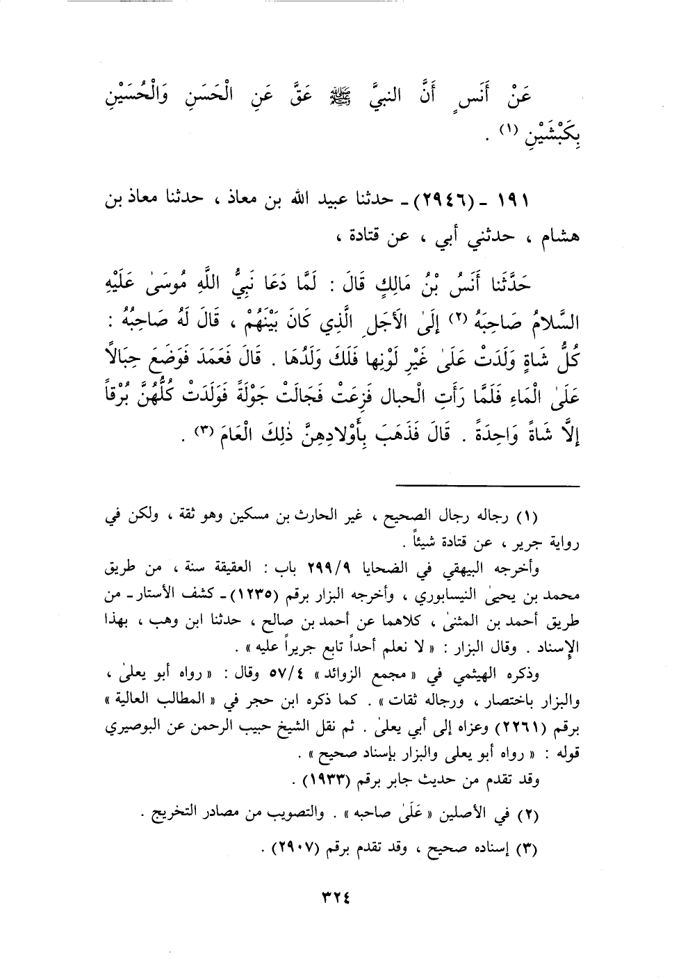 2946 - حَدَّثَنَا عُبَيْدُ اللَّهِ بْنُ مُعَاذٍ، حَدَّثَنَا مُعَاذُ بْنُ هِشَامٍ، حَدَّثَنِي أَبِي، عَنْ قَتَادَةَ، حَدَّثَنَا أَنَسُ بْنُ مَالِكٍ، قَالَ: " لَمَّا §دَعَا نَبِيُّ اللَّهِ مُوسَى عَلَيْهِ السَّلَامُ صَاحِبَهُ إِلَى الْأَجَلِ الَّذِي كَانَ بَيْنَهُمْ، قَالَ لَهُ صَاحِبُهُ: كُلُّ شَاةٍ وَلَدَتْ عَلَى غَيْرِ لَوْنِهَا فَلَكَ وَلَدُهَا، قَالَ: فَعَمَدَ فَوَضَعَ حِبَالًا عَلَى الْمَاءِ، فَلَمَّا رَأَتِ الْحِبَالَ فَزِعَتْ، فَجَالَتْ جَوْلَةً فَوَلَدَتْ كُلُّهُنَّ بُرْقًا إِلَّا شَاةً وَاحِدَةً، قَالَ فَذَهَبَ بِأَوْلَادِهِنَّ ذَلِكَ الْعَامَ "Kإسناده صحيح