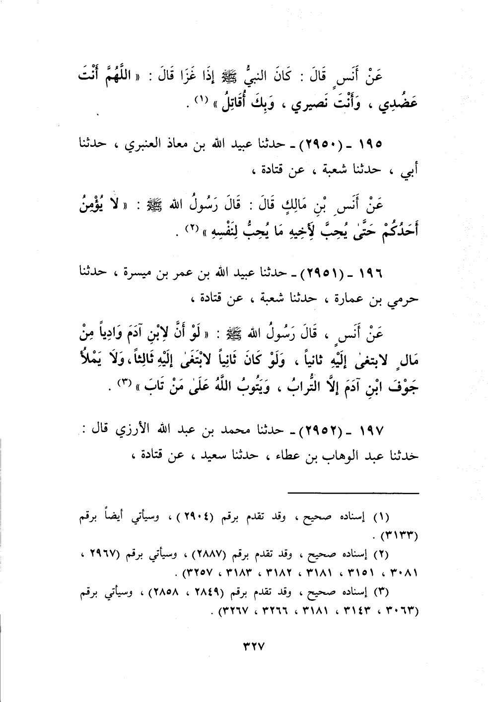 2950 - حَدَّثَنَا عُبَيْدُ اللَّهِ بْنُ مُعَاذٍ الْعَنْبَرِيُّ، حَدَّثَنَا أَبِي، حَدَّثَنَا شُعْبَةُ، عَنْ قَتَادَةَ، عَنْ أَنَسِ بْنِ مَالِكٍ، قَالَ: قَالَ رَسُولُ اللَّهِ صَلَّى اللهُ عَلَيْهِ وَسَلَّمَ: «§لَا يُؤْمِنُ أَحَدُكُمْ حَتَّى يُحِبَّ لِأَخِيهِ مَا يُحِبُّ لِنَفْسِهِ» Kإسناده صحيح