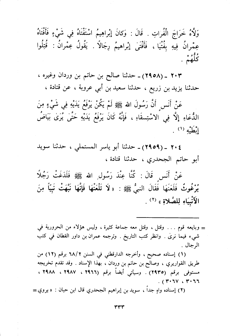 2958 - حَدَّثَنَا صَالِحُ بْنُ حَاتِمِ بْنِ وَرْدَانَ وَغَيْرُه، حَدَّثَنَا يَزِيدُ بْنُ زُرَيْعٍ، حَدَّثَنَا سَعِيدُ بْنُ أَبِي عَرُوبَةَ، عَنْ قَتَادَةَ، عَنْ أَنَسٍ، «أَنَّ رَسُولَ اللَّهِ صَلَّى اللهُ عَلَيْهِ وَسَلَّمَ §لَمْ يَكُنْ يَرْفَعُ يَدَيْهِ فِي شَيْءٍ مِنَ الدُّعَاءِ إِلَّا فِي الِاسْتِسْقَاءِ، فَإِنَّهُ كَانَ يَرْفَعُ يَدَيْهِ حَتَّى يَرَى بَيَاضَ إِبْطَيْهِ» Kإسناده صحيح