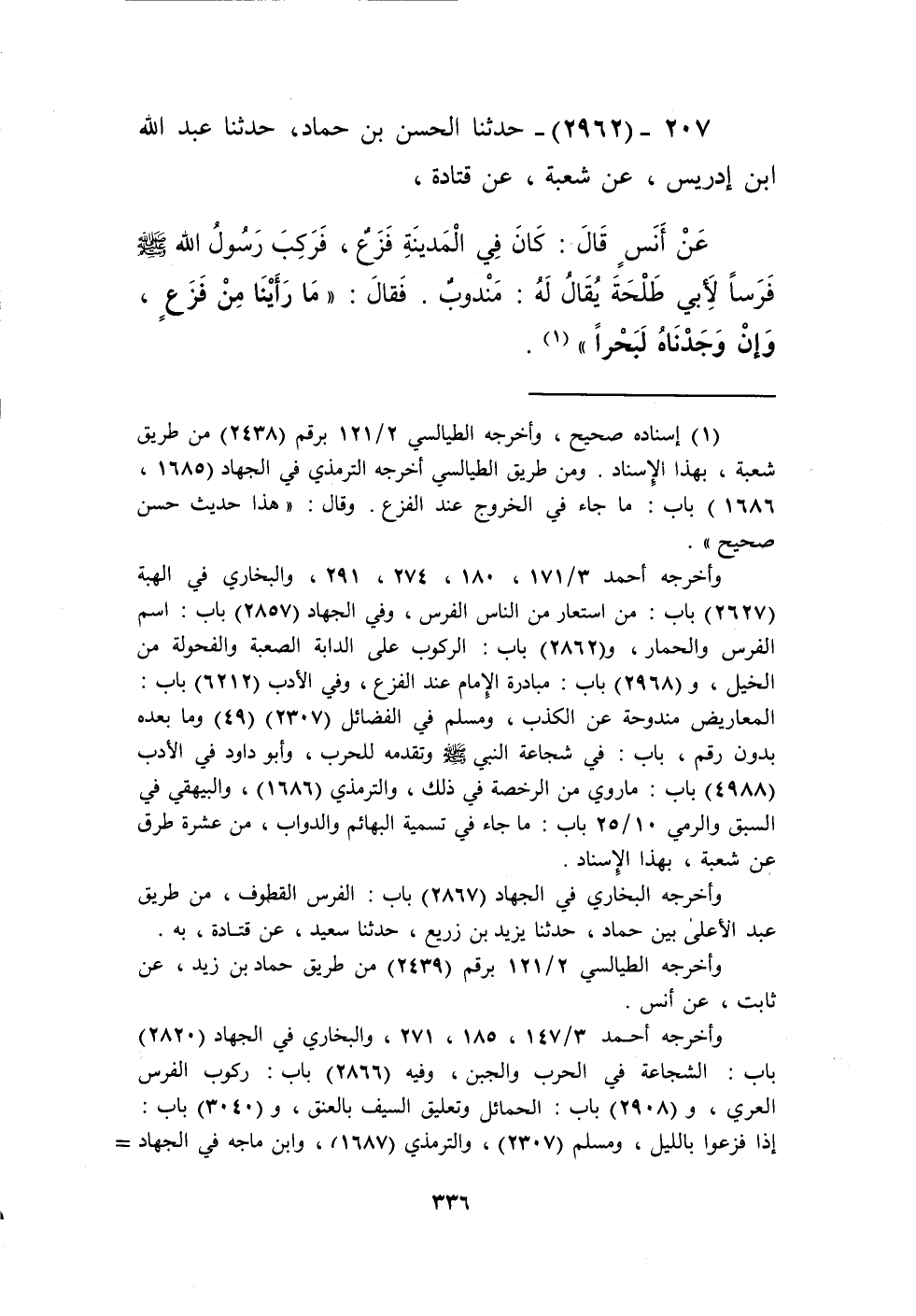 2962 - حَدَّثَنَا الْحَسَنُ بْنُ حَمَّادٍ، حَدَّثَنَا عَبْدُ اللَّهِ بْنُ إِدْرِيسَ، عَنْ شُعْبَةَ، عَنْ قَتَادَةَ، عَنْ أَنَسٍ، قَالَ: كَانَ فِي الْمَدِينَةِ فَزَعٌ فَرَكِبَ رَسُولُ اللَّهِ صَلَّى اللهُ عَلَيْهِ وَسَلَّمَ فَرَسًا لِأَبِي طَلْحَةَ يُقَالُ لَهُ: مَنْدُوبٌ فَقَالَ: «§مَا رَأَيْنَا مِنْ فَزَعٍ وَإِنْ وَجَدْنَاهُ لَبَحْرًا» Kإسناده صحيح