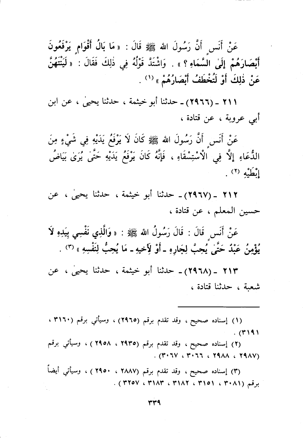 2967 - حَدَّثَنَا أَبُو خَيْثَمَةَ، حَدَّثَنَا يَحْيَى، عَنْ حُسَيْنٍ الْمُعَلِّمِ، عَنْ قَتَادَةَ، عَنْ أَنَسٍ، قَالَ: قَالَ رَسُولُ اللَّهِ صَلَّى اللهُ عَلَيْهِ وَسَلَّمَ: «§وَالَّذِي نَفْسِي بِيَدِهِ، لَا يُؤْمِنُ عَبْدٌ حَتَّى يُحِبَّ لِجَارِهِ أَوْ لِأَخِيهِ مَا يُحِبُّ لِنَفْسِهِ» Kإسناده صحيح