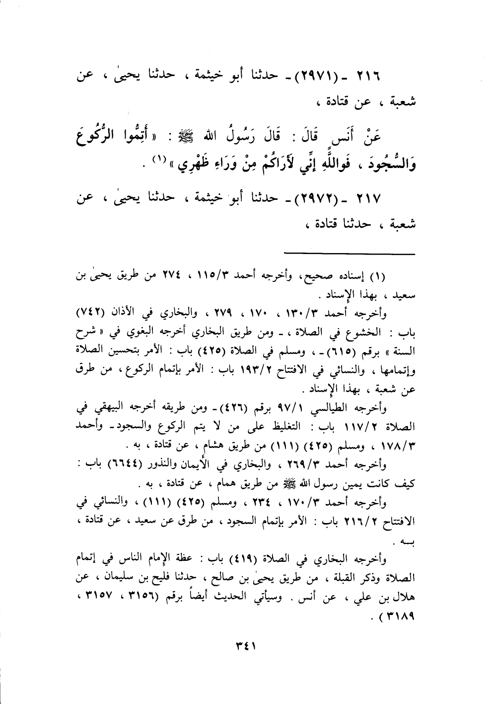 2971 - حَدَّثَنَا أَبُو خَيْثَمَةَ، حَدَّثَنَا يَحْيَى، عَنْ شُعْبَةَ، عَنْ قَتَادَةَ، عَنْ أَنَسٍ، قَالَ: قَالَ رَسُولُ صَلَّى اللهُ عَلَيْهِ وَسَلَّمَ: «§أَتِمُّوا الرُّكُوعَ وَالسُّجُودَ، فَوَاللَّهِ إِنِّي لَأَرَاكُمْ مِنْ وَرَاءِ ظَهْرِي» Kإسناده صحيح