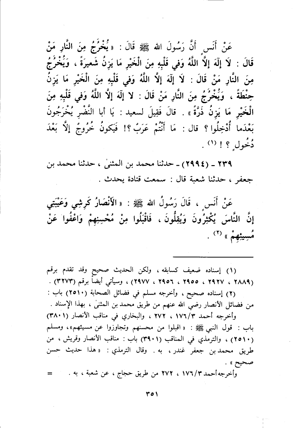 2994 - حَدَّثَنَا مُحَمَّدُ بْنُ الْمُثَنَّى، حَدَّثَنَا مُحَمَّدُ بْنُ جَعْفَرٍ، حَدَّثَنَا شُعْبَةُ، قَالَ: سَمِعْتُ قَتَادَةَ، يُحَدِّثُ عَنْ أَنَسٍ، قَالَ رَسُولُ اللَّهِ صَلَّى اللهُ عَلَيْهِ وَسَلَّمَ: «الْأَنْصَارُ كَرِشِي وَعَيْبَتِي، إِنَّ §النَّاسَ يُكْثِرُونَ وَيُقِلُّونَ فَاقْبَلُوا مِنْ مُحْسِنِهِمْ وَاعْفُوا عَنْ مُسِيئِهِمْ»