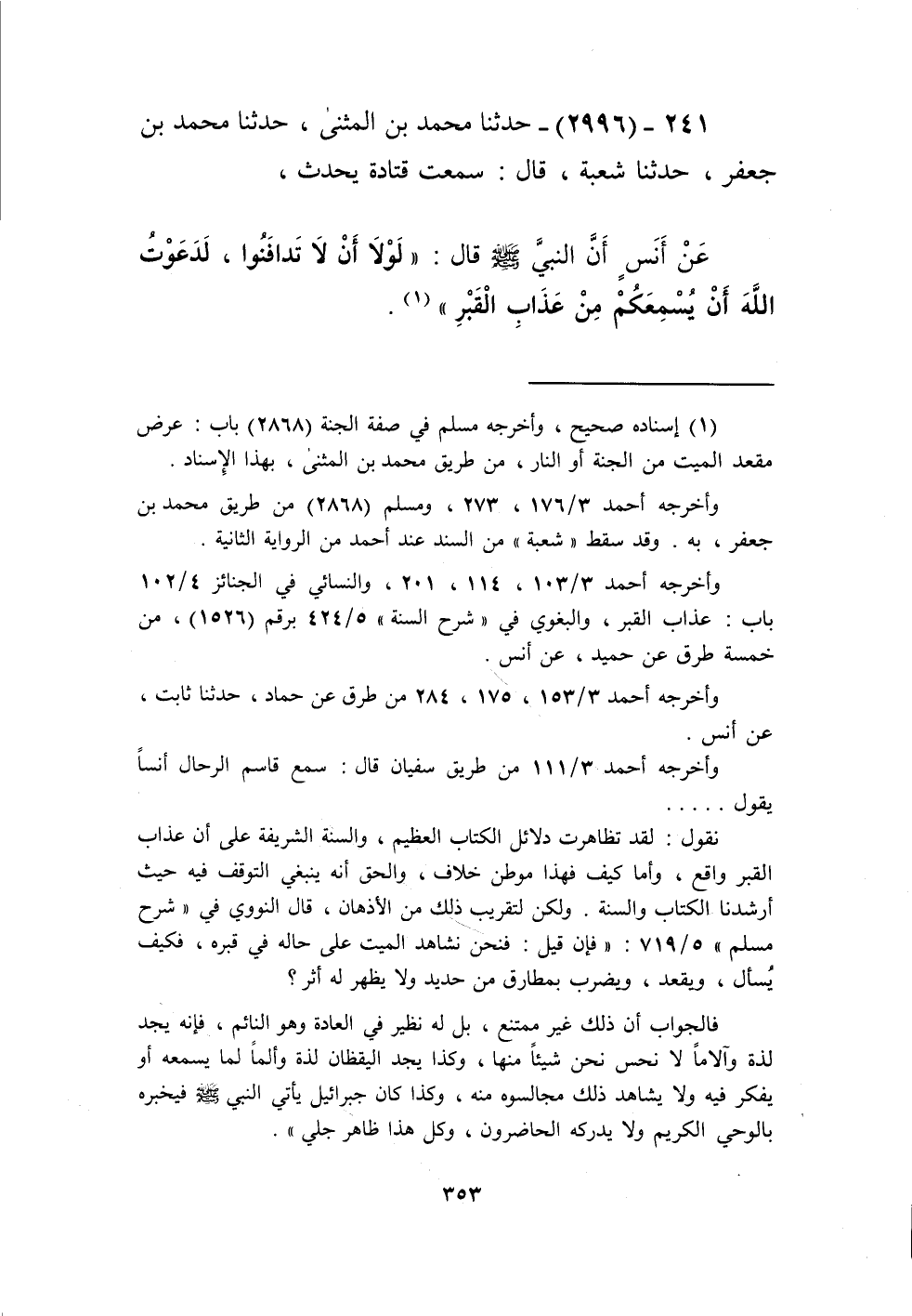 2996 - حَدَّثَنَا مُحَمَّدُ بْنُ الْمُثَنَّى، حَدَّثَنَا مُحَمَّدُ بْنُ جَعْفَرٍ، حَدَّثَنَا شُعْبَةُ، قَالَ: سَمِعْتُ قَتَادَةَ، يُحَدِّثُ عَنْ أَنَسٍ، أَنَّ النَّبِيَّ صَلَّى اللهُ عَلَيْهِ وَسَلَّمَ قَالَ: «§لَوْلَا أَنْ لَا تَدَافَنُوا لَدَعَوْتُ اللَّهَ أَنْ يُسْمِعَكُمْ مِنْ عَذَابِ الْقَبْرِ» Kإسناده صحيح