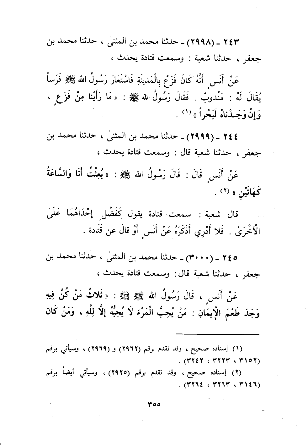 3001 - حَدَّثَنَا أَبُو مُوسَى، حَدَّثَنَا أَبُو دَاوُدَ، حَدَّثَنَا شُعْبَةُ، عَنْ قَتَادَةَ، قَالَ: سَمِعْتُ أَنَسَ بْنَ مَالِكٍ، قَالَ: قَالَ رَسُولُ اللَّهِ صَلَّى اللهُ عَلَيْهِ وَسَلَّمَ مِثْلَهُ غَيْرَ أَنَّهُ، قَالَ: «وَجَدَ بِهِنَّ حَلَاوَةَ الْإِيمَانِ» Kإسناده صحيح