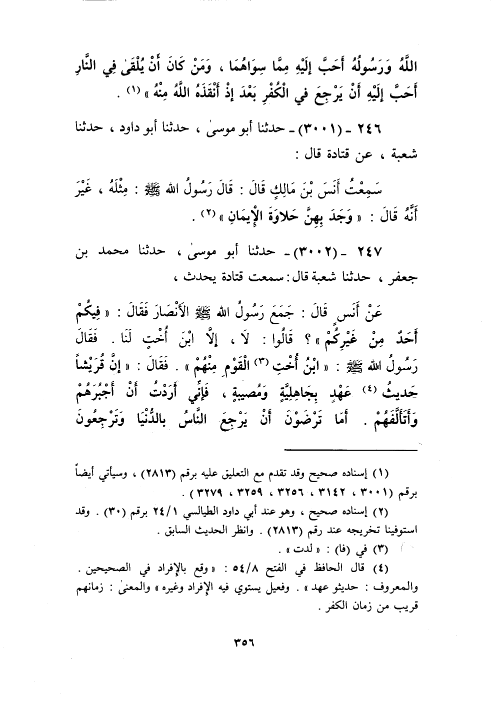 3002 - حَدَّثَنَا أَبُو مُوسَى، حَدَّثَنَا مُحَمَّدُ بْنُ جَعْفَرٍ، حَدَّثَنَا شُعْبَةُ، قَالَ: سَمِعْتُ قَتَادَةَ، يُحَدِّثُ، عَنْ أَنَسٍ، قَالَ: جَمَعَ رَسُولُ اللَّهِ صَلَّى اللهُ عَلَيْهِ وَسَلَّمَ الْأَنْصَارَ فَقَالَ: «فِيكُمْ أَحَدٌ مِنْ غَيْرِكُمْ» قَالُوا: لَا، إِلَّا ابْنَ أُخْتٍ لَنَا، فَقَالَ رَسُولُ اللَّهِ صَلَّى اللهُ عَلَيْهِ وَسَلَّمَ: «ابْنُ أُخْتِ الْقَوْمِ مِنْهُمْ» فَقَالَ: «إِنَّ §قُرَيْشًا حَدِيثُ عَهْدٍ بِجَاهِلِيَّةٍ وَمُصِيبَةٍ، فَإِنِّي أَرَدْتُ أَنْ أَجْبُرَهُمْ وَأَتَأَلَّفَهُمْ، أَمَا تَرْضَوْنَ أَنْ يَرْجِعَ النَّاسُ بِالدُّنْيَا وَتَرْجِعُونَ -[357]- بِرَسُولِ اللَّهِ إِلَى بُيُوتِكُمْ، لَوْ سَلَكَ النَّاسُ وَادِيًا وَسَلَكَتِ الْأَنْصَارُ شِعْبًا لَسَلَكْتُ شِعْبَ الْأَنْصَارِ» Kإسناده صحيح