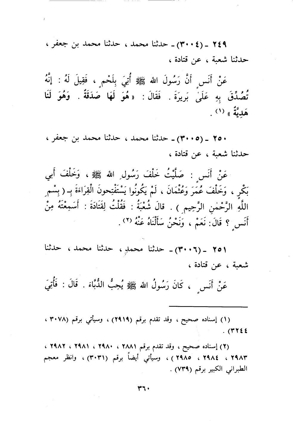 3005 - حَدَّثَنَا مُحَمَّدٌ، حَدَّثَنَا مُحَمَّدُ بْنُ جَعْفَرٍ، حَدَّثَنَا شُعْبَةُ، عَنْ قَتَادَةَ، عَنْ أَنَسٍ، " §صَلَّيْتُ خَلْفَ رَسُولِ اللَّهِ صَلَّى اللهُ عَلَيْهِ وَسَلَّمَ وَخَلْفَ أَبِي بَكْرٍ وَخَلْفَ عُمَرَ وَعُثْمَانَ، لَمْ يَكُونُوا يَسْتَفْتِحُونَ الْقِرَاءَةَ بِـ {بِسْمِ اللَّهِ الرَّحْمَنِ الرَّحِيمِ} [الفاتحة: 1] " قَالَ شُعْبَةُ: فَقُلْتُ لِقَتَادَةَ: أَسَمِعْتَهُ مِنْ أَنَسٍ؟ قَالَ: نَعَمْ، وَنَحْنُ سَأَلْنَاهُ عَنْهُKإسناده صحيح