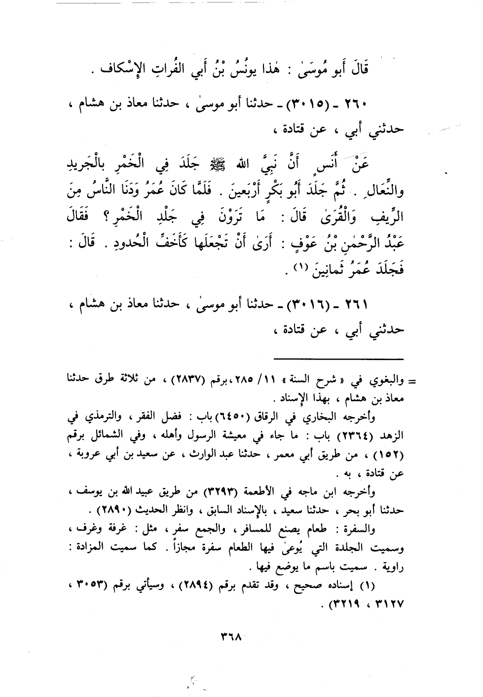 3015 - حَدَّثَنَا أَبُو مُوسَى، حَدَّثَنَا مُعَاذُ بْنُ هِشَامٍ، حَدَّثَنِي أَبِي، عَنْ قَتَادَةَ، عَنْ أَنَسٍ، " أَنَّ نَبِيَّ اللَّهِ صَلَّى اللهُ عَلَيْهِ وَسَلَّمَ §جَلَدَ فِي الْخَمْرِ بِالْجَرِيدِ وَالنِّعَالِ، ثُمَّ جَلَدَ أَبُو بَكْرٍ أَرْبَعِينَ، فَلَمَّا كَانَ عُمَرُ وَدَنَا النَّاسُ مِنَ الرِّيفِ وَالْقُرَى، قَالَ: مَا تَرَوْنَ فِي جَلْدِ الْخَمْرِ "، فَقَالَ عَبْدُ الرَّحْمَنِ بْنُ عَوْفٍ: أَرَى أَنْ تَجْعَلَهَا كَأَخَفِّ الْحُدُودِ، قَالَ: فَجَلَدَ عُمَرُ ثَمَانِينَKإسناده صحيح