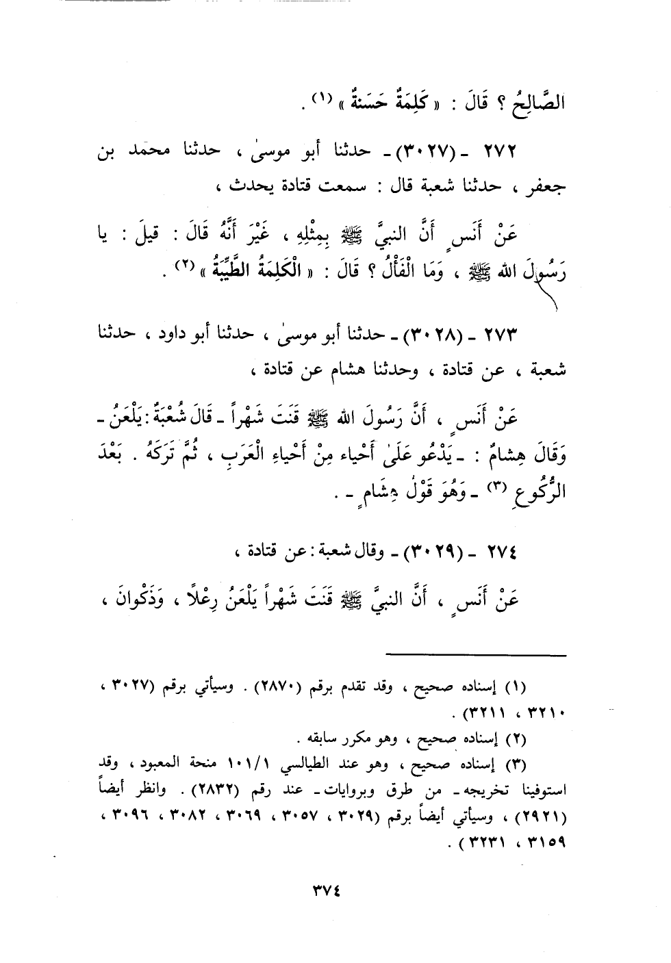 3029 - وَقَالَ شُعْبَةُ، عَنْ قَتَادَةَ، عَنْ أَنَسٍ، «أَنَّ النَّبِيَّ صَلَّى اللهُ عَلَيْهِ وَسَلَّمَ §قَنَتَ شَهْرًا يَلْعَنُ رِعْلًا وَذَكْوَانَ وَبَنِي لِحْيَانَ» Kإسناده صحيح