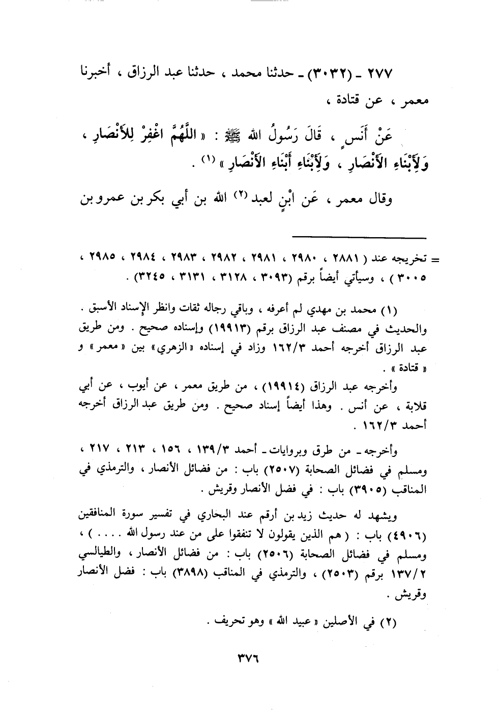 3032 - حَدَّثَنَا مُحَمَّدٌ، حَدَّثَنَا عَبْدُ الرَّزَّاقِ، أَخْبَرَنَا مَعْمَرٌ، عَنْ قَتَادَةَ، عَنْ أَنَسٍ، قَالَ رَسُولُ اللَّهِ صَلَّى اللهُ عَلَيْهِ وَسَلَّمَ: «§اللَّهُمَّ اغْفِرْ لِلْأَنْصَارِ، وَلِأَبْنَاءِ الْأَنْصَارِ، وَلِأَبْنَاءِ أَبْنَاءِ الْأَنْصَارِ» وَقَالَ مَعْمَرٌ، عَنِ ابْنٍ لِعَبْدِ اللَّهِ بْنِ أَبِي بَكْرِ بْنِ عَمْرِو بْنِ حَزْمٍ، قَالَ: فَكَانَ أَبِي يَقُولُ: مَا بَقِيَ مِنْ أَهْلِ الدَّعْوَةِ غَيْرِيKإسناده رجاله ثقات