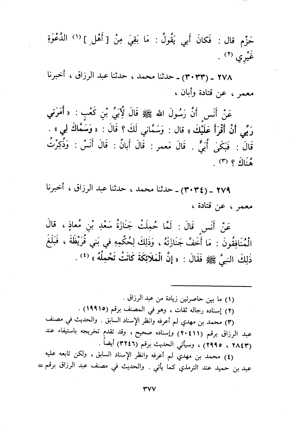 3034 - حَدَّثَنَا مُحَمَّدٌ، حَدَّثَنَا عَبْدُ الرَّزَّاقِ، أَخْبَرَنَا مَعْمَرٌ، عَنْ قَتَادَةَ، عَنْ أَنَسٍ، قَالَ: لَمَّا حُمِلَتْ جِنَازَةُ سَعْدِ بْنِ مُعَاذٍ قَالَ الْمُنَافِقُونَ: مَا أَخَفَّ جِنَازَتَهُ، وَذَلِكَ لِحُكْمِهِ فِي بَنِي قُرَيْظَةَ، فَبَلَغَ ذَلِكَ النَّبِيَّ صَلَّى اللهُ عَلَيْهِ وَسَلَّمَ فَقَالَ: «إِنَّ §الْمَلَائِكَةَ كَانَتْ تَحْمِلُهُ»