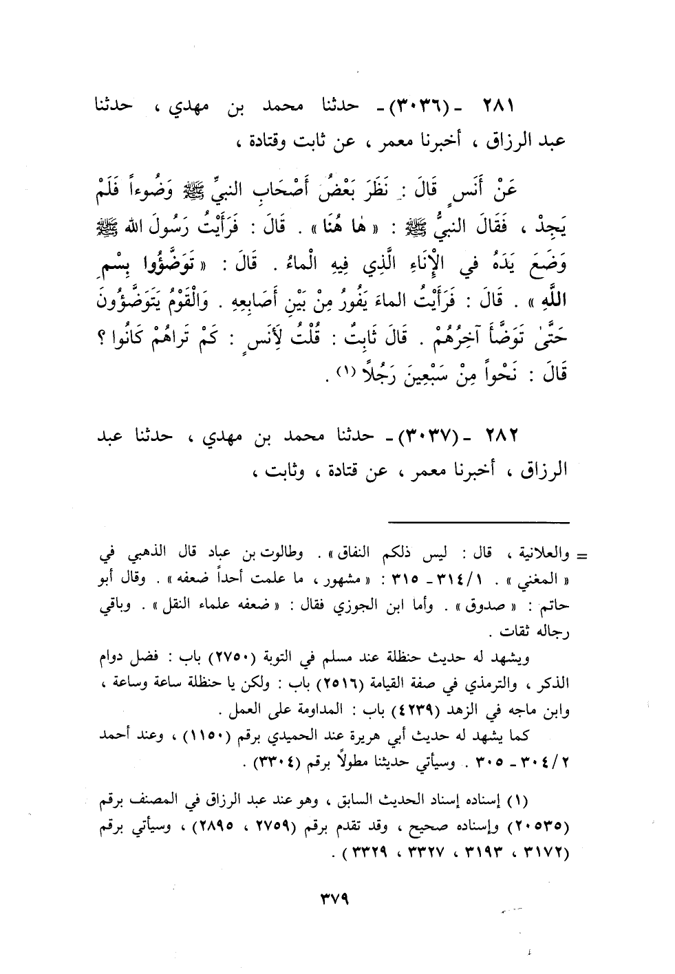3036 - حَدَّثَنَا مُحَمَّدُ بْنُ مَهْدِيٍّ، حَدَّثَنَا عَبْدُ الرَّزَّاقِ، أَخْبَرَنَا مَعْمَرٌ، عَنْ ثَابِتٍ، وَقَتَادَةَ، عَنْ أَنَسٍ، قَالَ: نَظَرَ بَعْضُ أَصْحَابِ النَّبِيِّ صَلَّى اللهُ عَلَيْهِ وَسَلَّمَ وَضُوءًا فَلَمْ يَجِدْ، فَقَالَ النَّبِيُّ صَلَّى اللهُ عَلَيْهِ وَسَلَّمَ: «§هَا هُنَا» قَالَ: فَرَأَيْتُ رَسُولَ اللَّهِ صَلَّى اللهُ عَلَيْهِ وَسَلَّمَ وَضَعَ يَدَهُ فِي الْإِنَاءِ الَّذِي فِيهِ الْمَاءُ قَالَ: «تَوَضَّئُوا بِسْمِ اللَّهِ» قَالَ: فَرَأَيْتُ الْمَاءَ يَفُورُ مِنْ بَيْنِ أَصَابِعِهِ، وَالْقَوْمُ يَتَوَضَّئُونَ حَتَّى تَوَضَّأَ آخِرُهُمْ، قَالَ ثَابِتٌ: قُلْتُ لِأَنَسٍ: كَمْ تُرَاهُمْ كَانُوا؟ قَالَ: نَحْوًا مِنْ سَبْعِينَ رَجُلًاKإسناده صحيح